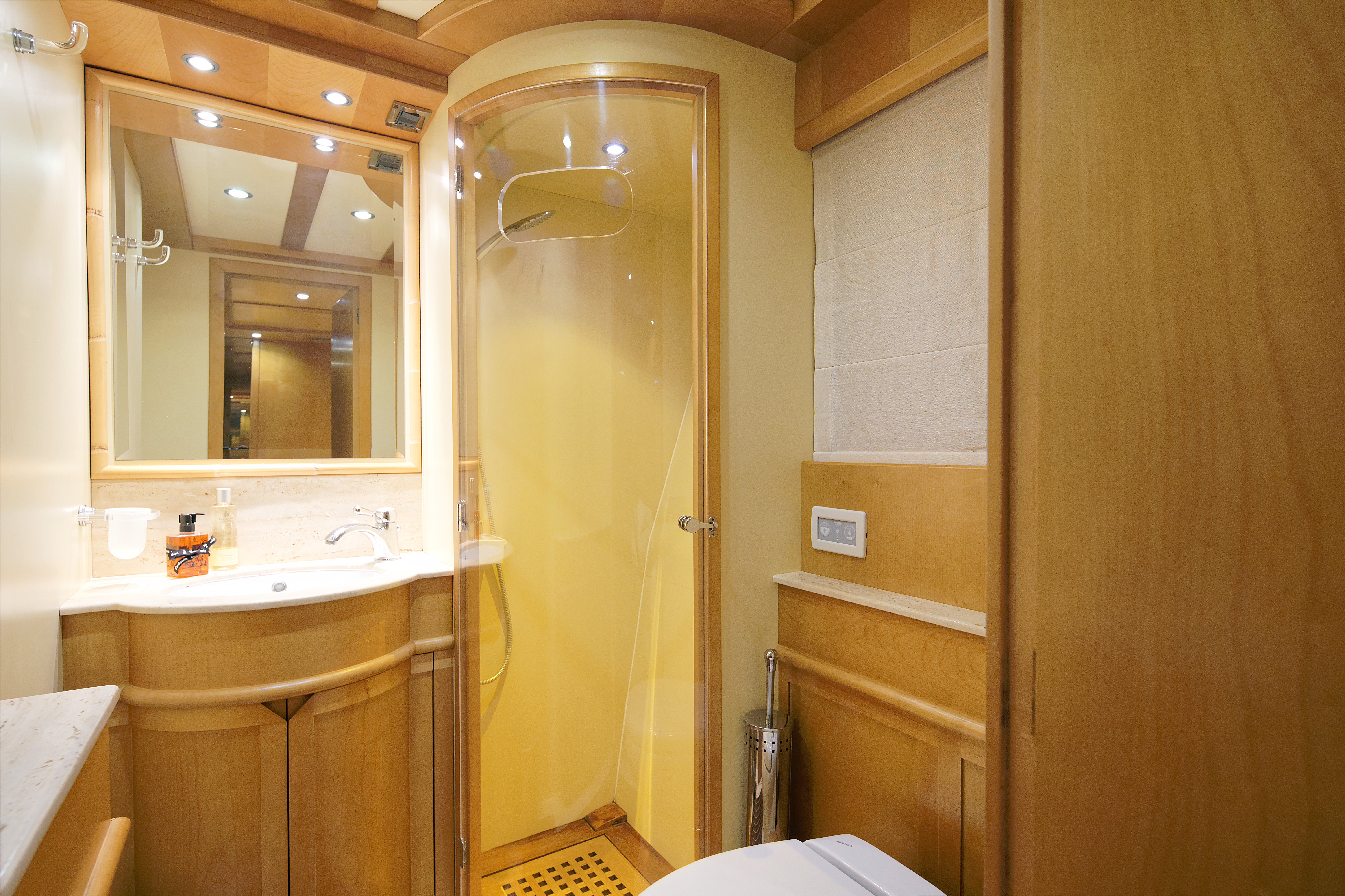 Up, on the flybridge, there is an aft corner sofa to port ideal for alfresco dining and outdoor living, and a canvas roof can be erected to provide shade.