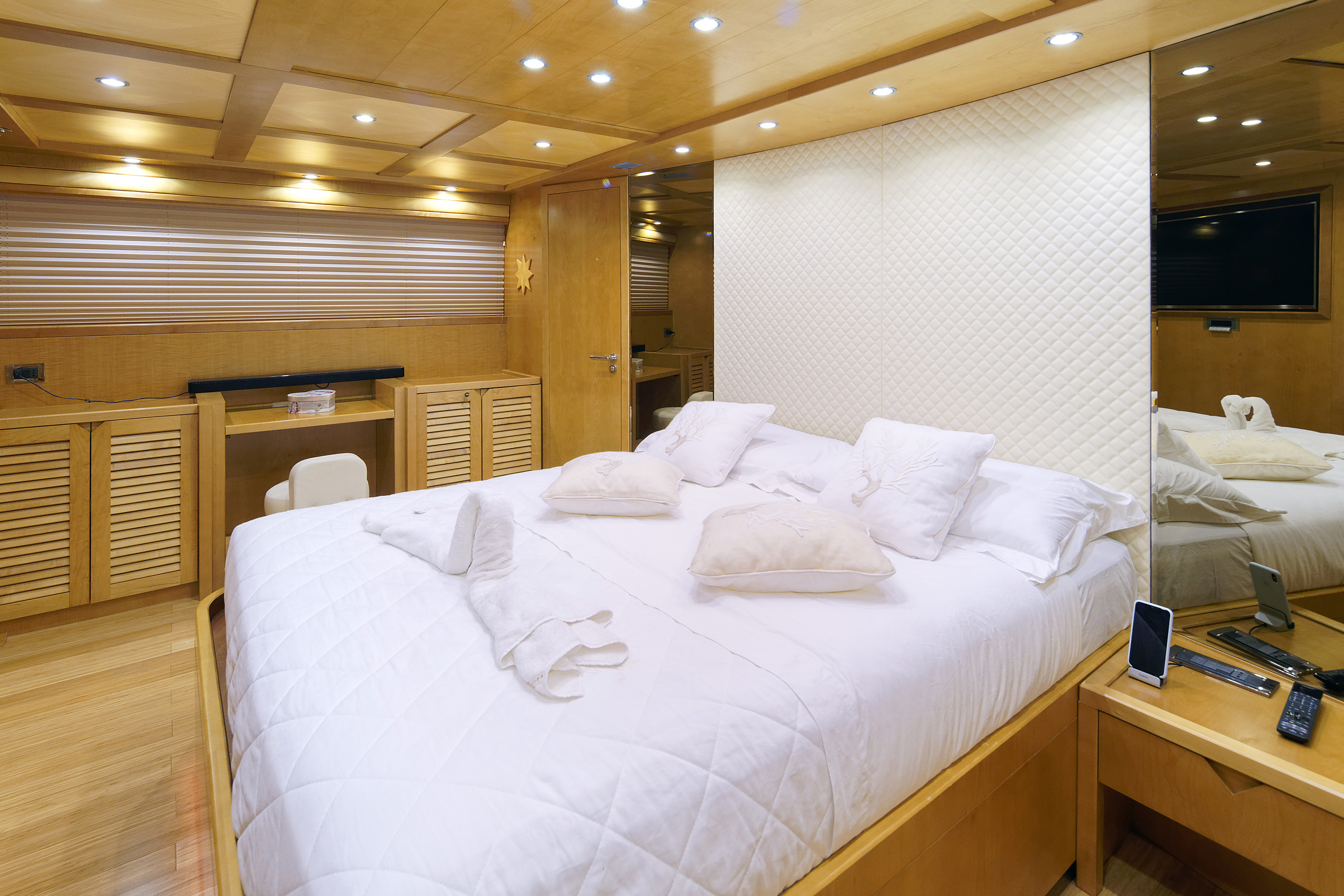 The yacht can offer deluxe accommodation in four lovely cabins sleeping up to ten charter guests on board. She has a crew of four.