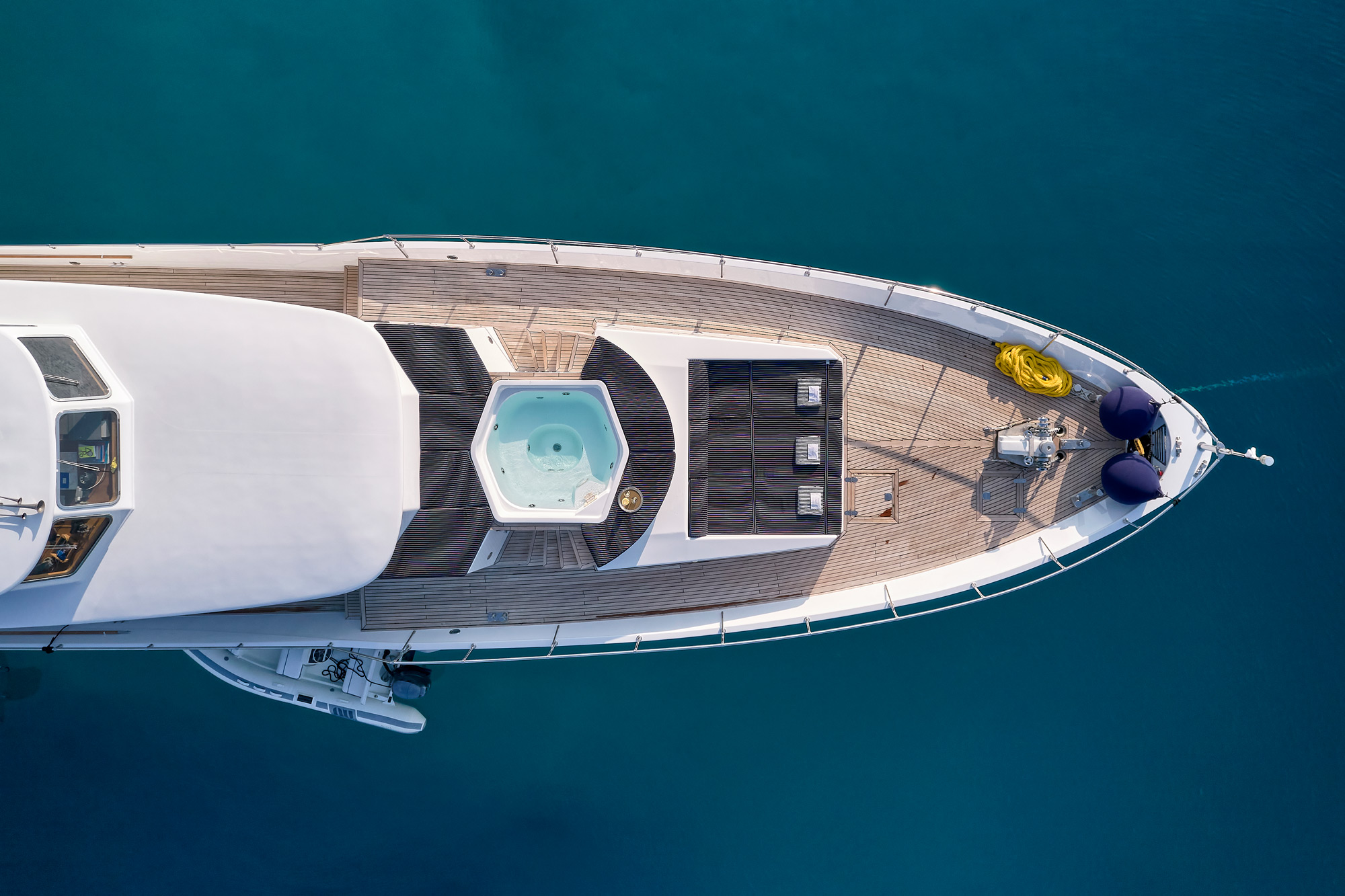 On the foredeck, there is a massive Jacuzzi for the group to soak, socialise and enjoy the views. On the bow, a triple sofa/sunbed provides a place for guests to dry off and savour the sunshine.