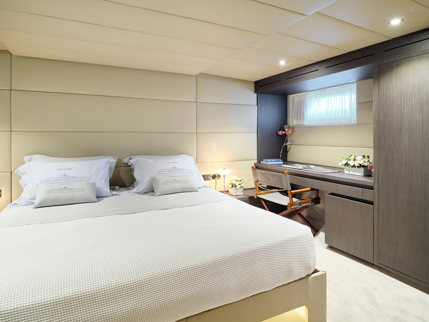 The broad beam provides spacious guest accommodation on the lower deck which consists of a Master suite as well as three double cabins and a twin cabin, all with en-suite facilities.
