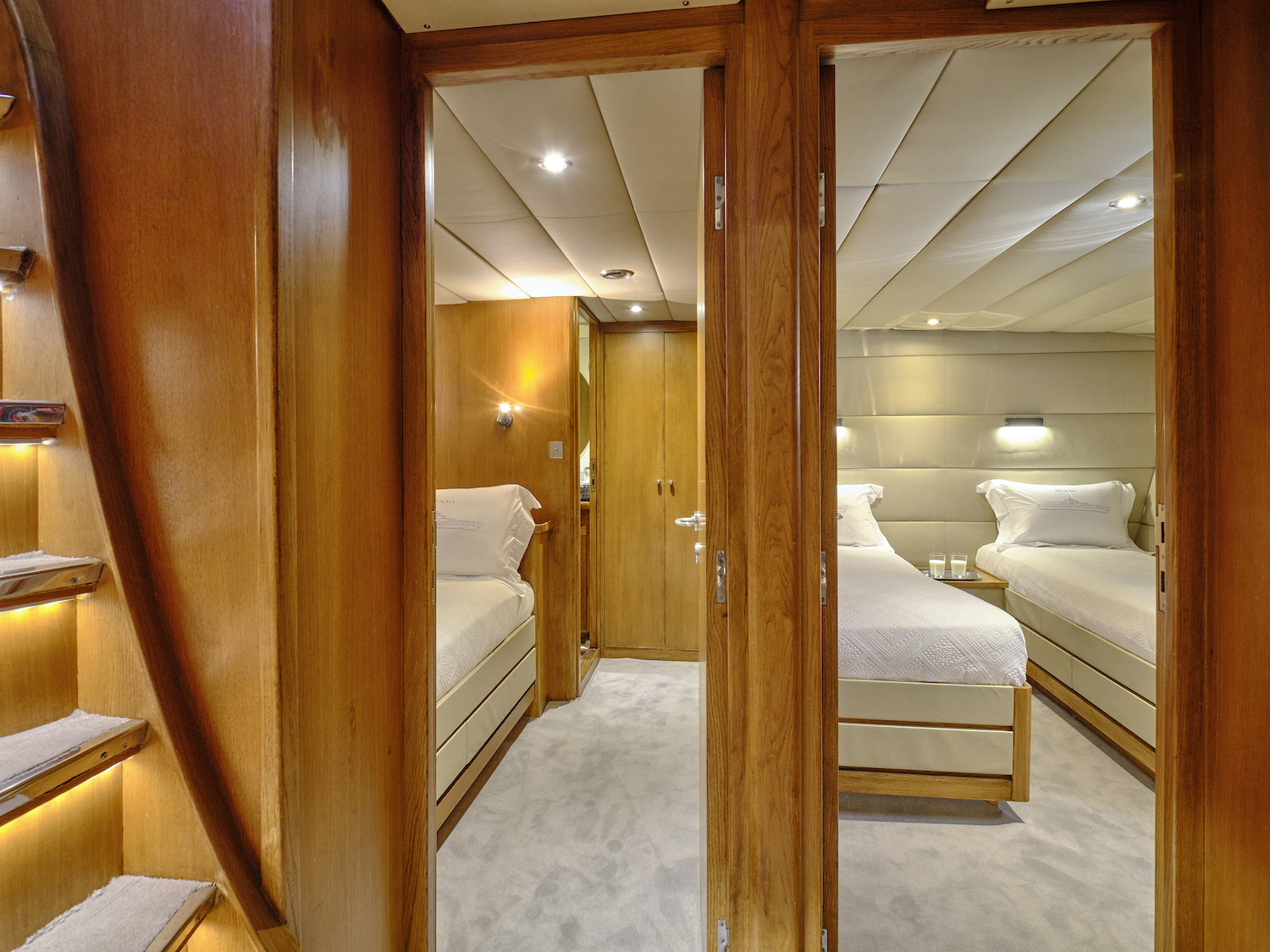 Measuring 33.00m (108' 3”), she is able to accommodate up to 11 charter guests in a comfortable and inviting environment and a cabin layout that includes five staterooms. Her crew of 6 offers highly-professional service throughout the entire vacation.