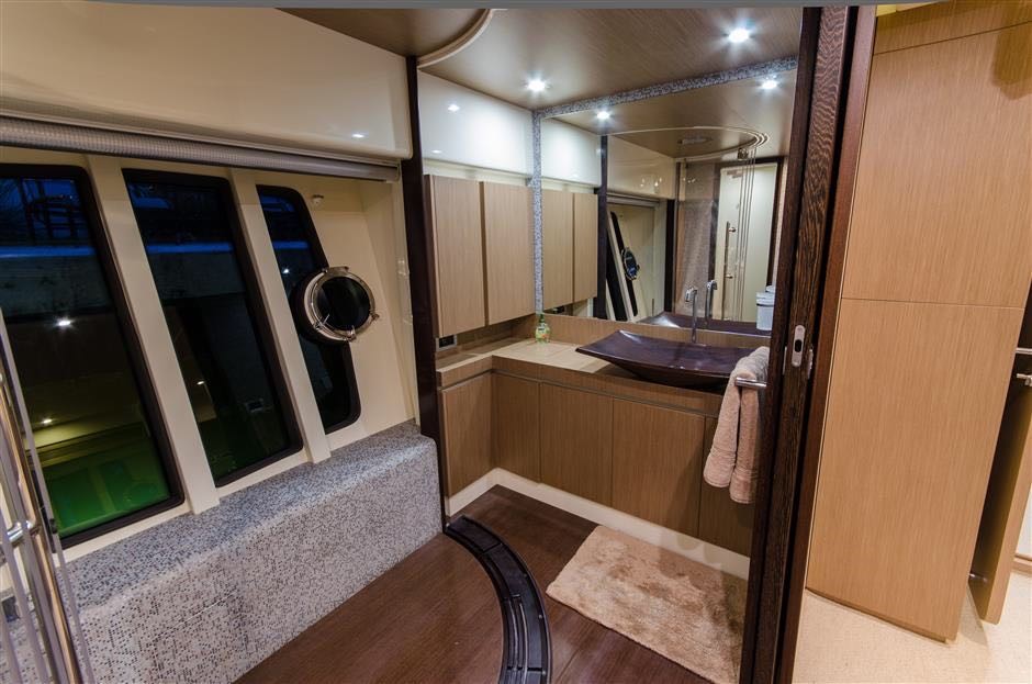 Furthermore, there is a twin cabin forward to port with ensuite, while to starboard is a guest cabin with a queen bed and ensuite. The VIP offers a queen bed and ensuite bathroom and is located forward spreading full beam of the yacht. Every room beside the master contains 18' Samsung flat screen with Kaleidescape, Direct and Satellite TV.
