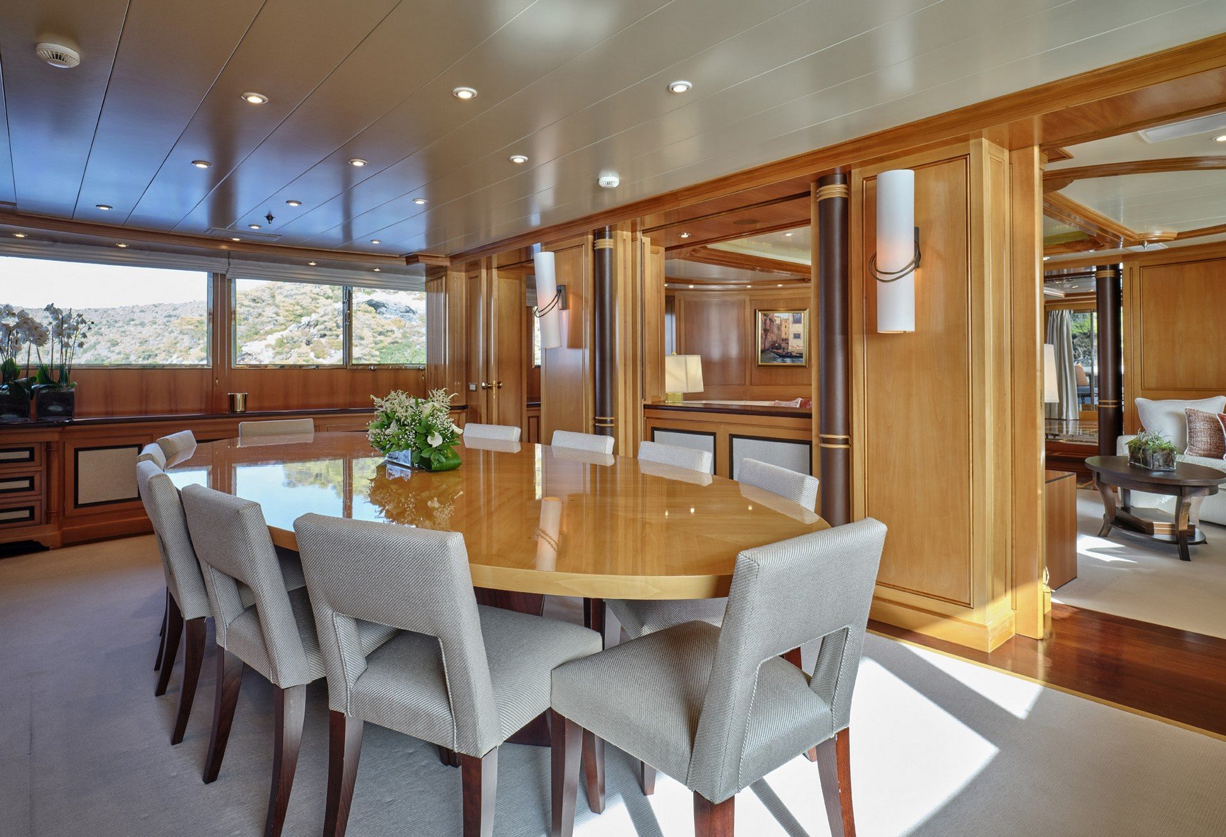 The interior of this yacht is cosy and comfortable and is composed of a large salon with a formal dining room as well as a casual lounge and gaming area.