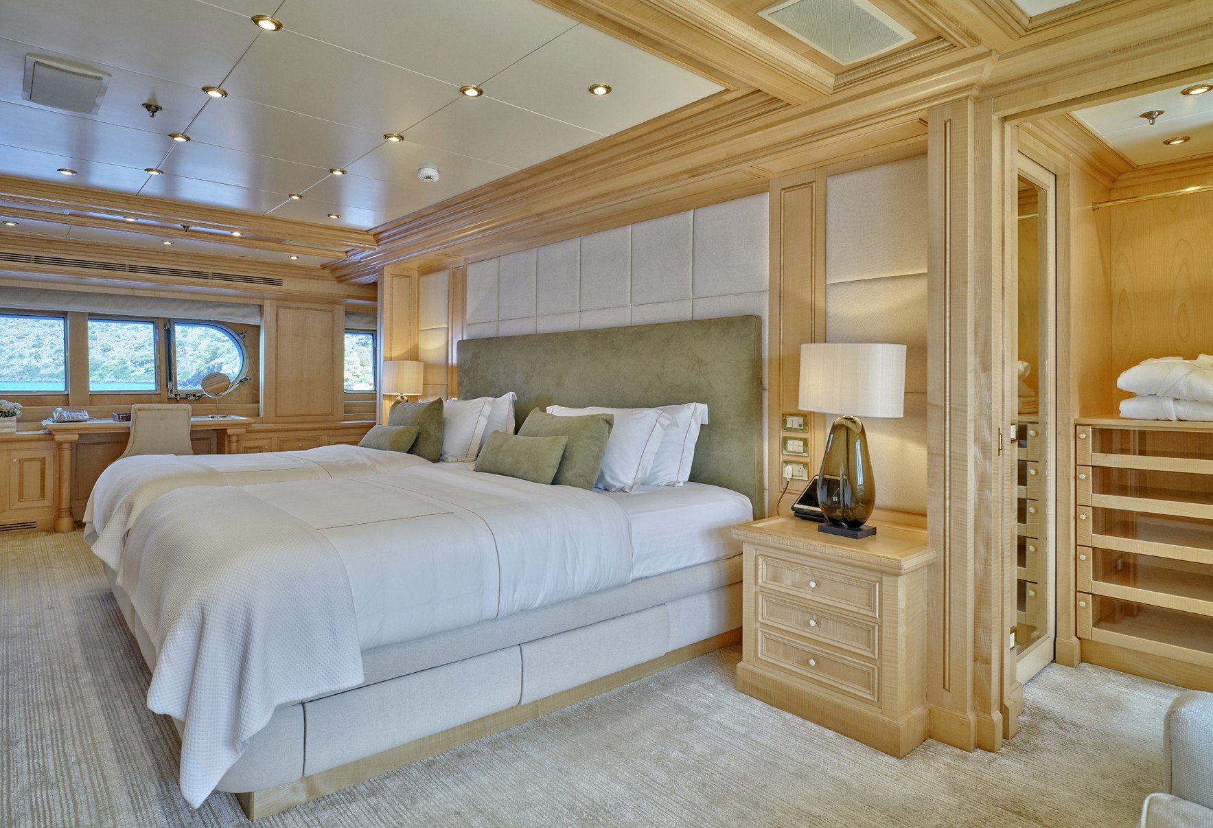 The Master suite comprises a King size bed. It is full width of the yacht. 2 full size beds are joined. The Owners suite boasts a study as well as a his and hers bathroom with spa pool tub and LCD TV.