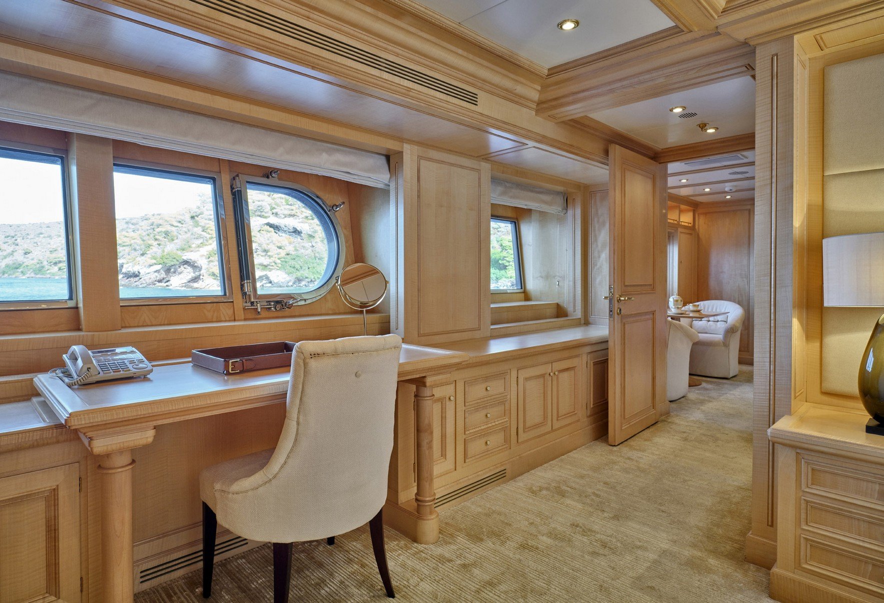 The Master suite comprises a King size bed. It is full width of the yacht. 2 full size beds are joined. The Owners suite boasts a study as well as a his and hers bathroom with spa pool tub and LCD TV.