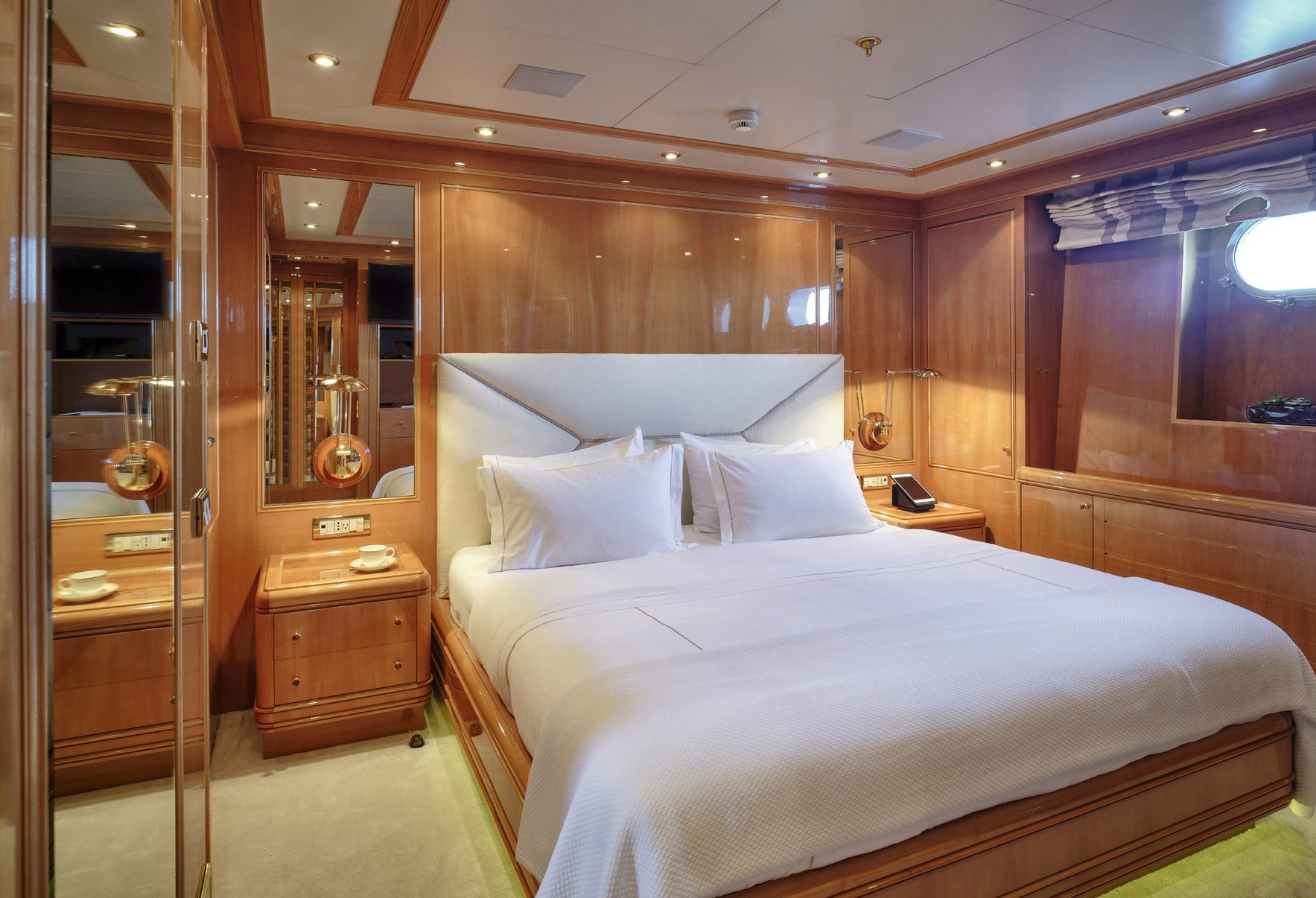 The Master suite comprises a King size bed. It is full width of the yacht. 2 full size beds are joined. The Owners suite boasts a study as well as a his and hers bathroom with spa pool tub and LCD TV.