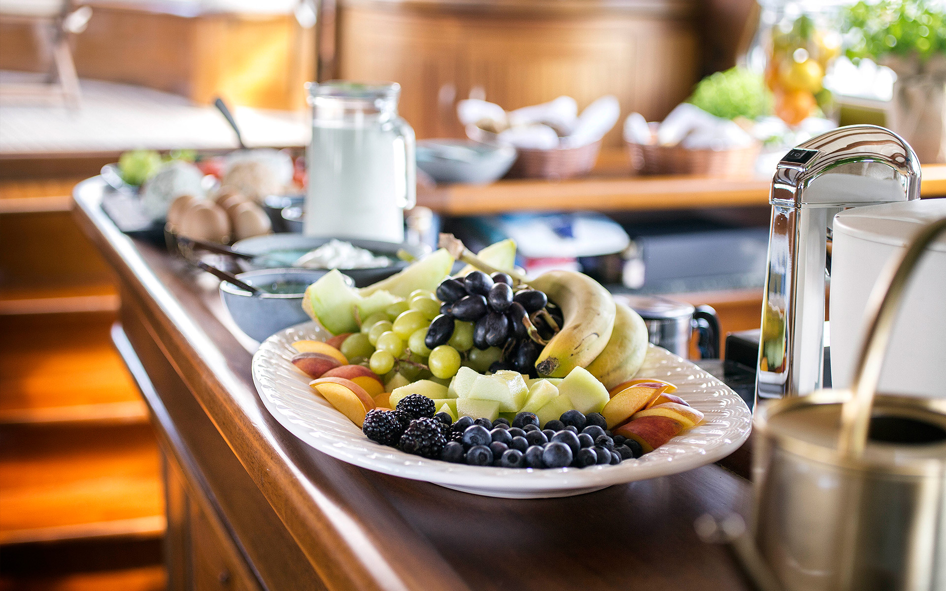 The opposite is the port-side galley/breakfast bar for efficient service throughout the occasion, and the atmospheric interior receives an abundance of natural light from the surrounding windows.