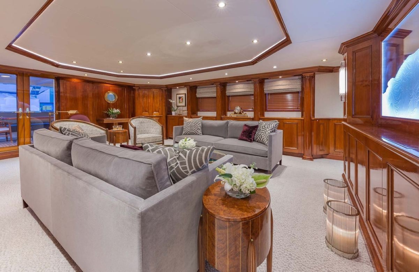 The main salon treats guests to a large and intimate environment that places the sofas and armchairs close together centrally for drinks and conversation. Farther forward, the corridor creates a separation between the lounge and the forward formal dining area, designed to seat up to six guests around a circular table for a memorable occasion.