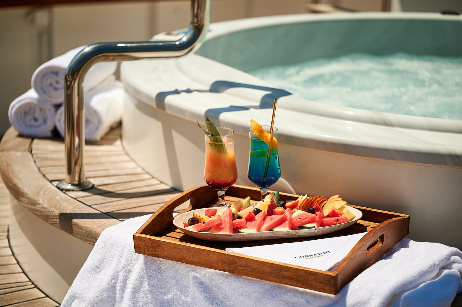 A sizeable raised Jacuzzi is immediately behind the bridge and the rest of the aft section is dedicated to eight sun loungers, all of which enjoy sweeping views and plenty of sunshine.