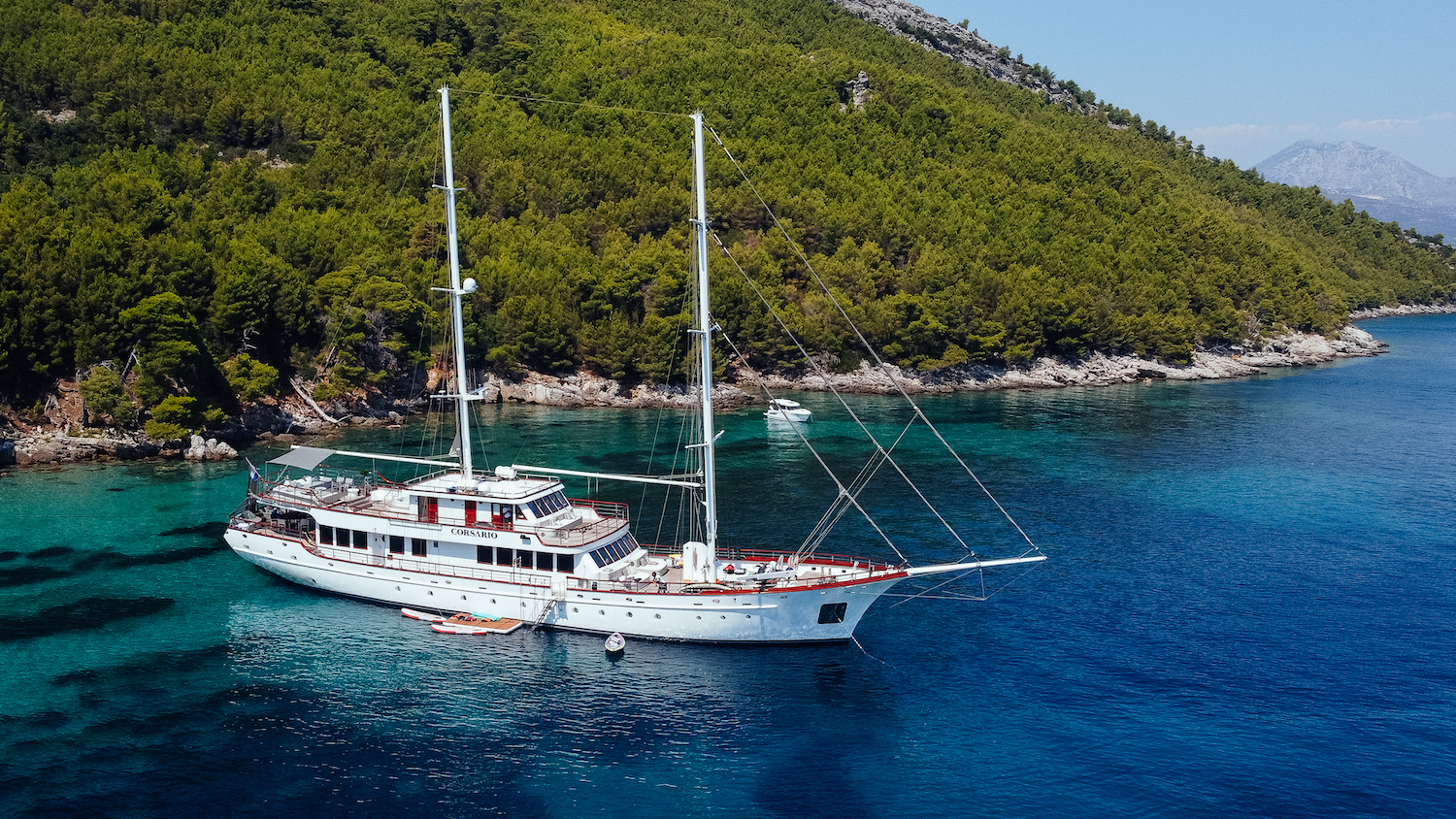 48m motor sailer yacht CORSARIO provides yacht charters in The Mediterranean, Europe, Zadar, Venice, Trogir, Sukosan, and Split.