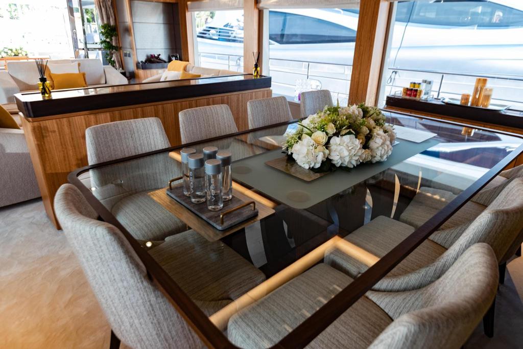 The main deck aft is accessed via the stairways and the shaded cockpit places a sofa along the stern and a raised table for alfresco dining and outdoor living. On either side, the railings fold down to become side-terraces and ...