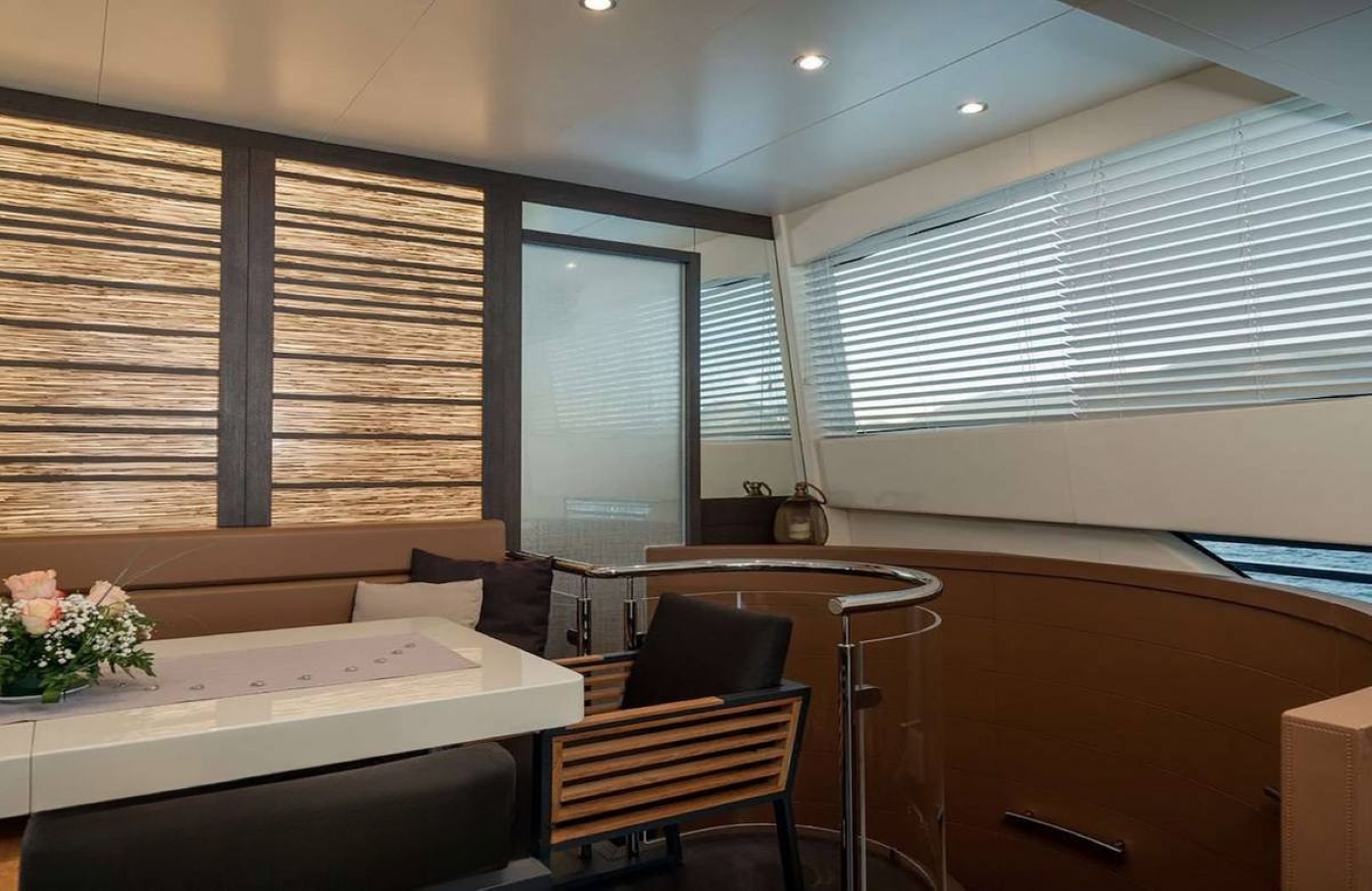 The main deck aft is accessed via the stairways and the shaded cockpit places a sofa along the stern and a raised table for alfresco dining and outdoor living. On either side, the railings fold down to become side-terraces and ...