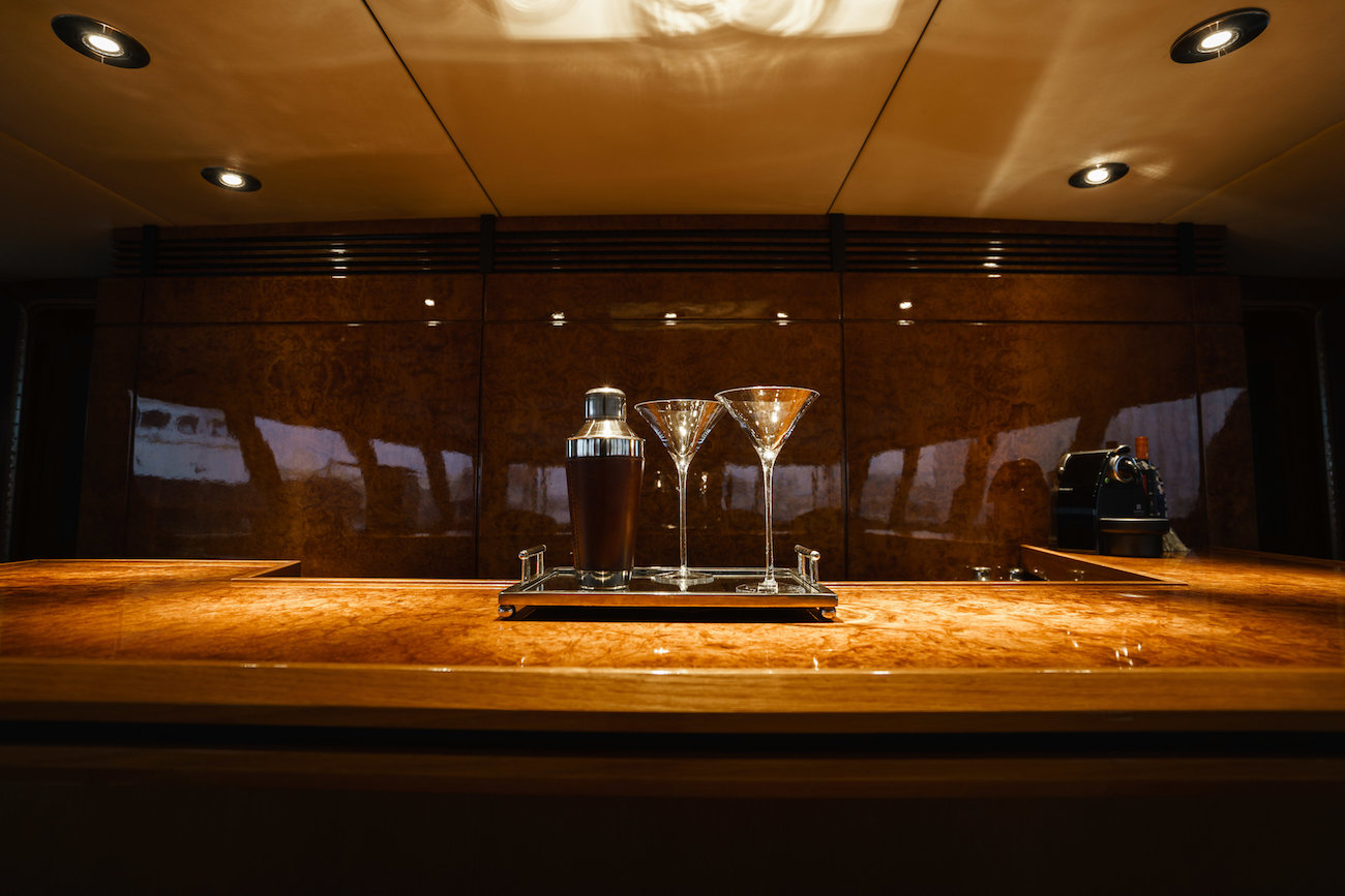 The aft lounge is surrounded by windows with classic frames that add to the ambience for day or evening functions. Within, there is a sensational forward bar with a pale gloss tabletop and seats for six guests.