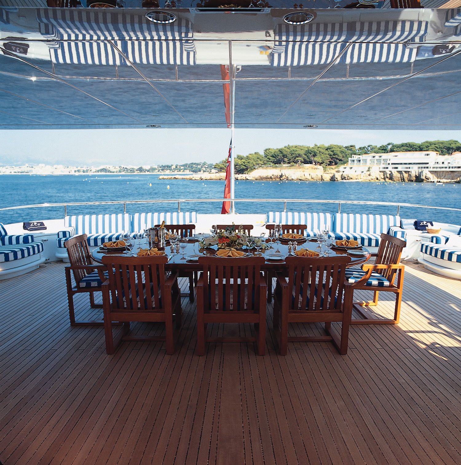 She features a spectacular sun deck on which guests can relax and enjoy a meal or laze around with a good book.