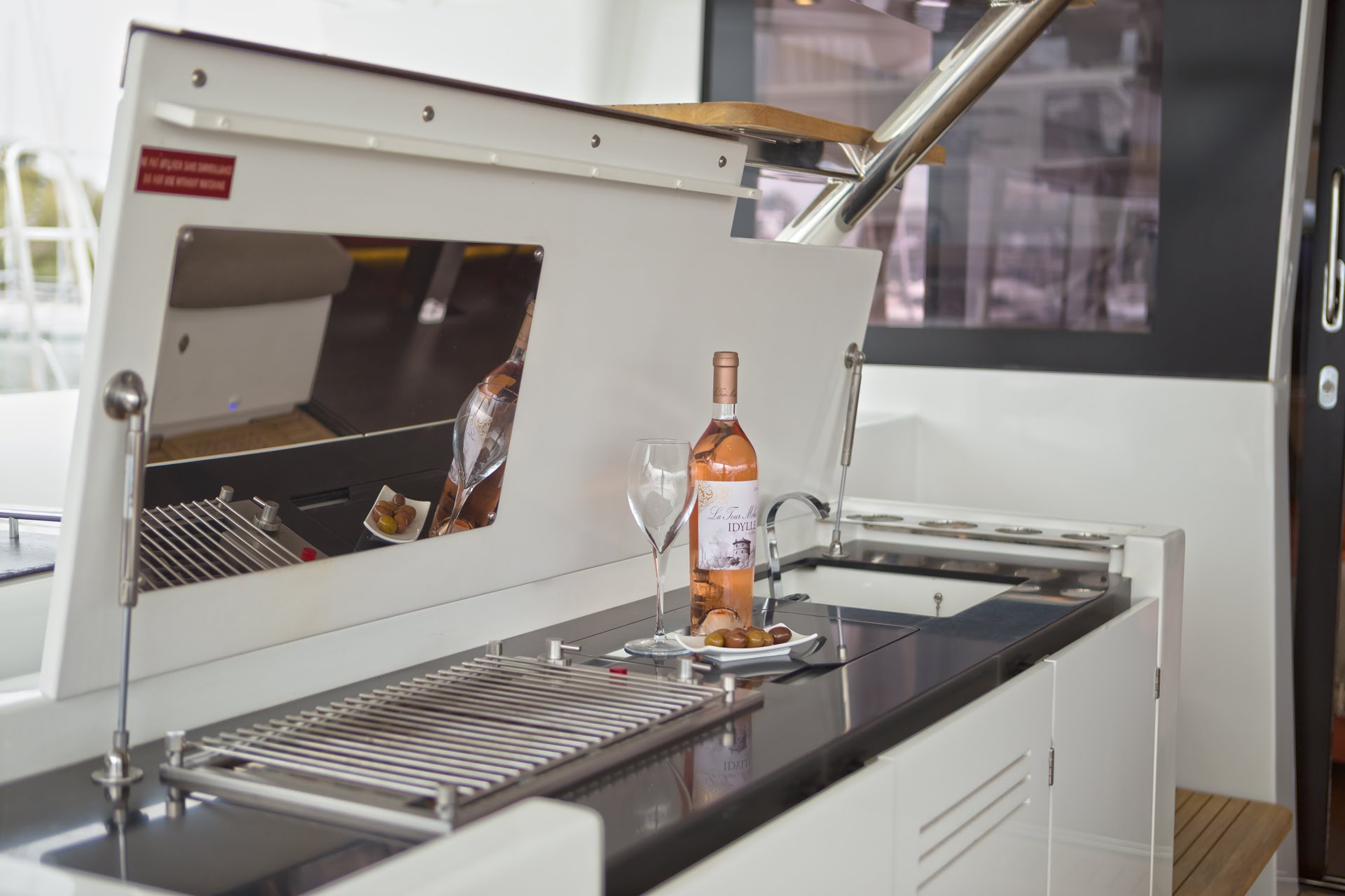 A swim platform lowers gently into the water and while cruising it is used to store the tender.