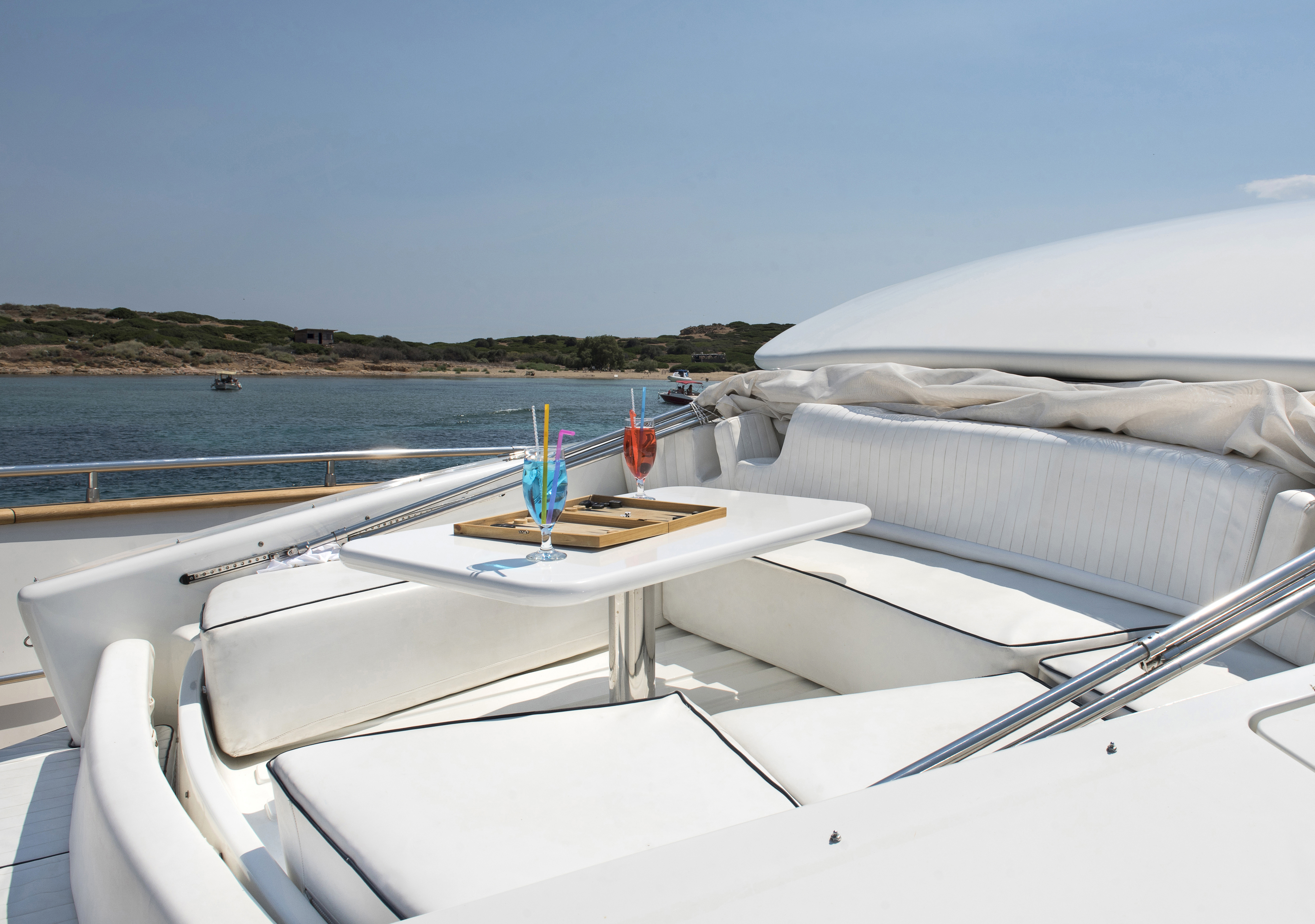 On the bow, the sun pad section converts into a casual alfresco dining area with a snack/drinks table and a C-shaped sofa where the group can take in the ...