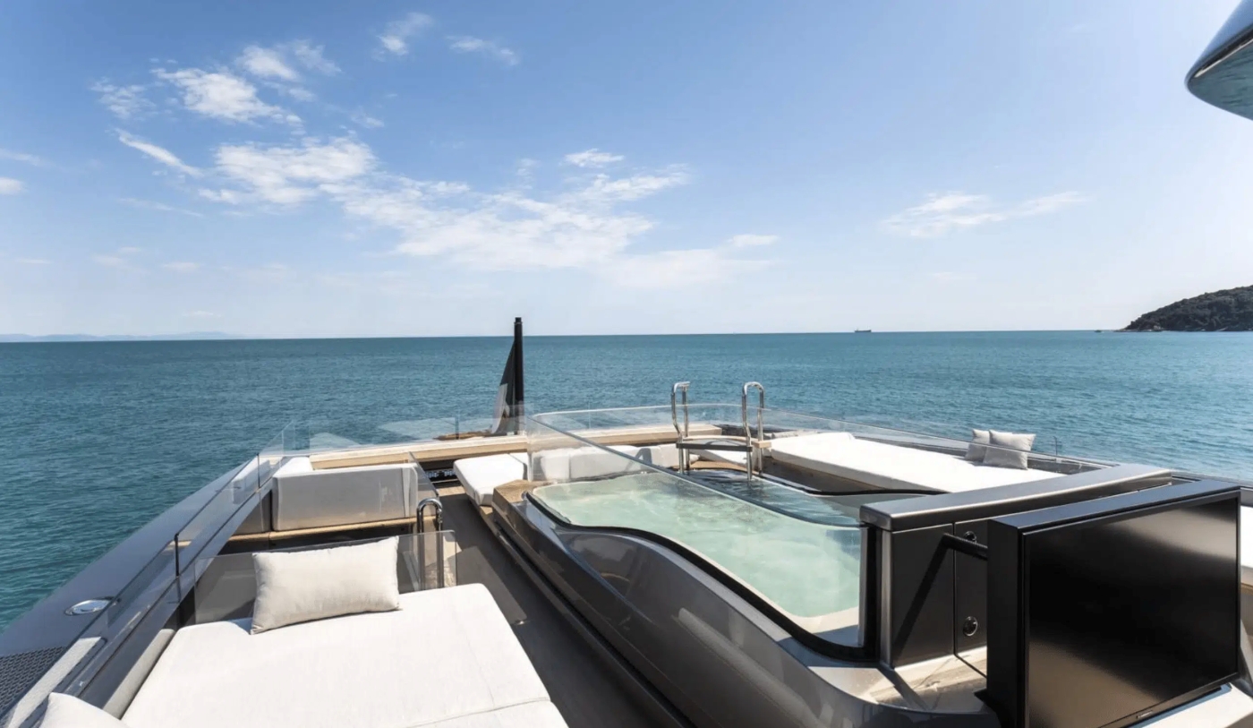 The main saloon offers plenty of seating, while the dining area is separated from this area by a designer ‘green wall’. A full-beam master suite with a walk-in wardrobe and a bathroom with hammam is also situated on this deck.