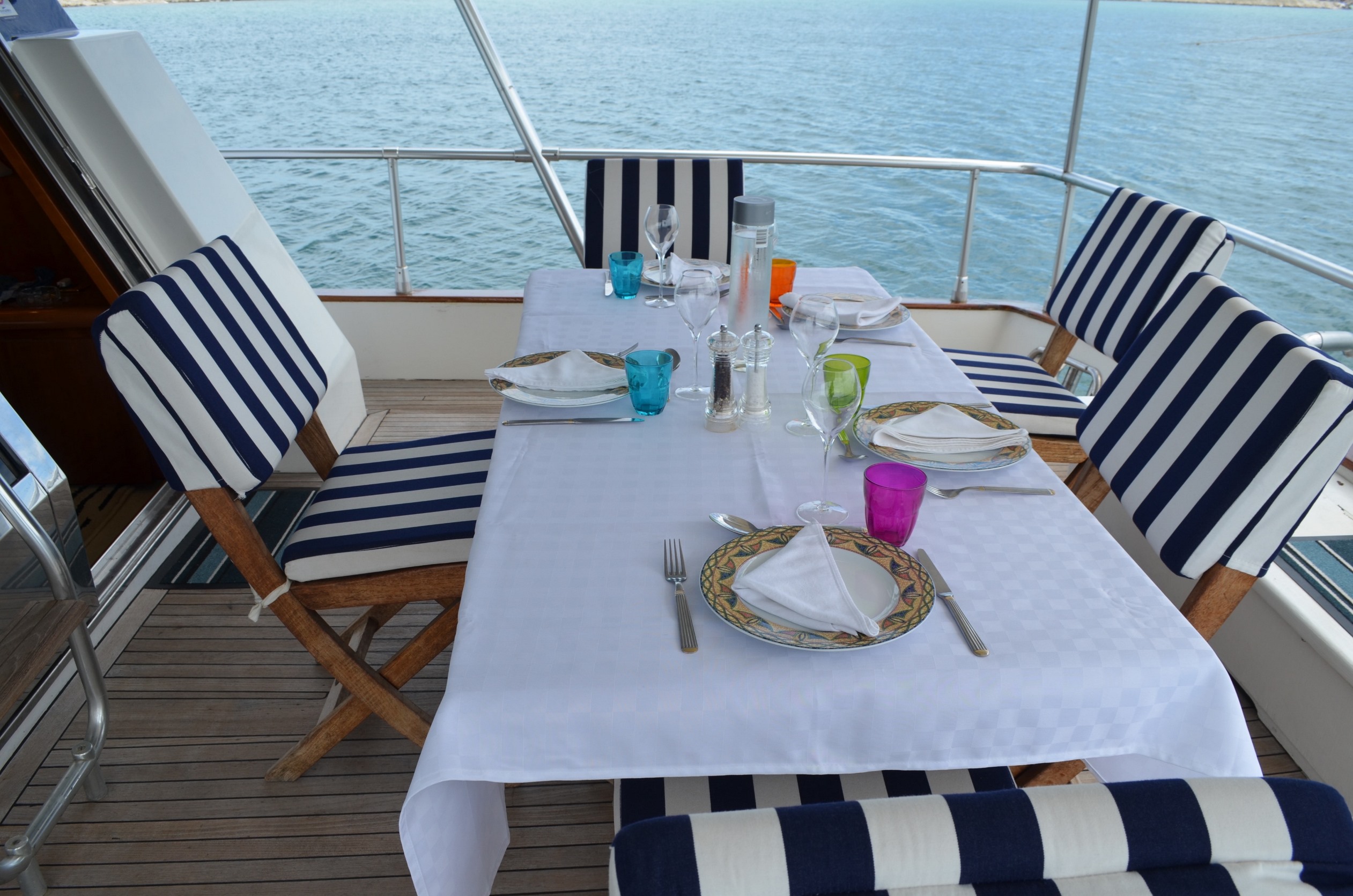 Her exterior living is over 2 levels, comprising a shaded aft deck offering alfresco dining, a large foredeck boasting a raised sunpad, plus a well-appointed upper deck, where a further alfresco dining option and sitting area are ideal for any occassion.