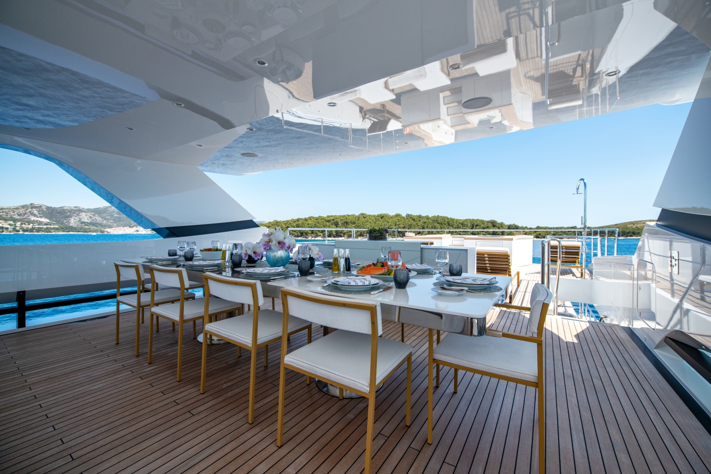 The yacht features striking exterior and interior design by Francesco Paszkowski with accommodation for up to twelve guests and a crew of nine.