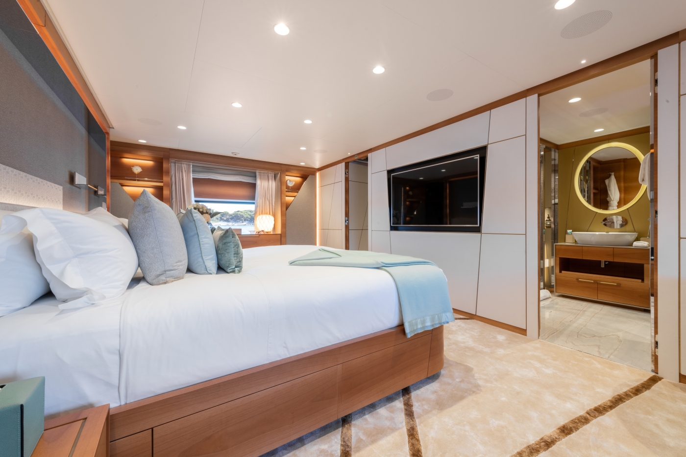 The skylounge to the aft also doubles as a cosy cinema, and the surrounding windows ensure that there is plenty of natural light for daytime use as a tranquil second lounge.