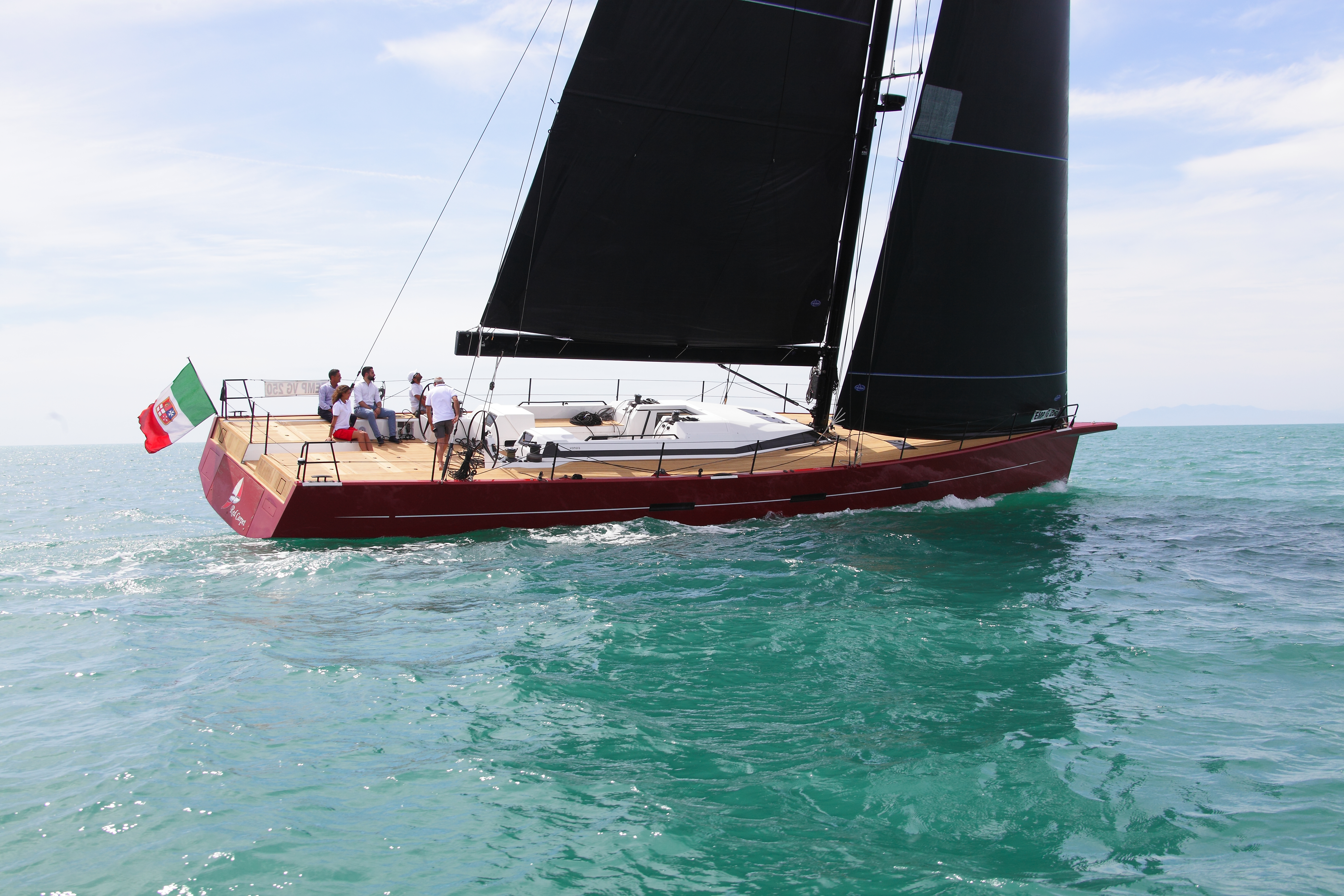 Sailing yacht RED CARPET measures 21.82m (71' 7") and was built by the Vismara shipyard in 2017. She is able to accommodate up to 6 guests in three twin cabins. There is a crew of two on board.