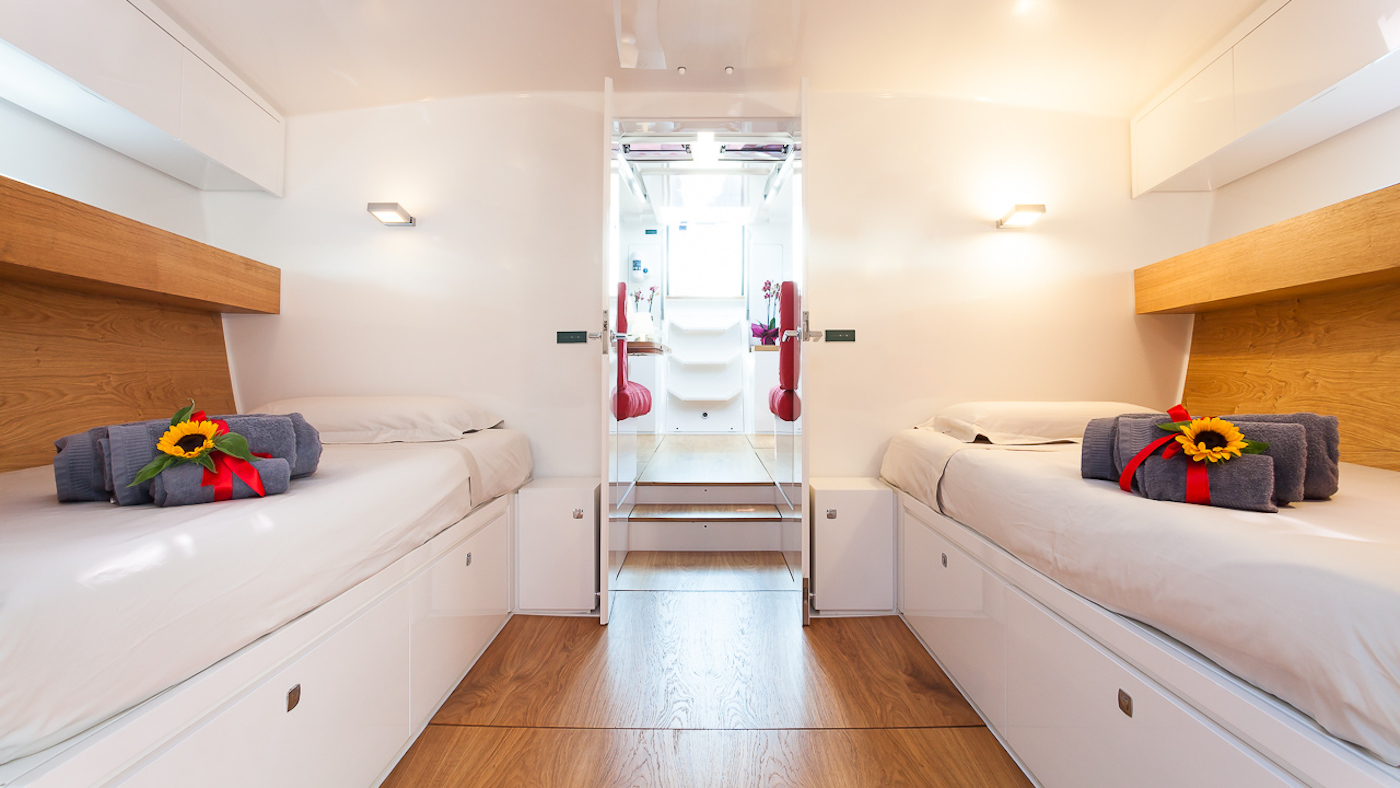 She is able to accommodate up to 6 guests in three twin cabins. There is a crew of two on board.
