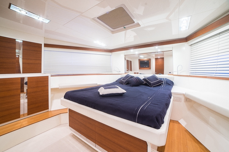 Amidships to starboard is an L-shaped sofa and fold-out table for casual drinks or dining together as a large group, while a widescreen TV opposite provides entertainment. The Master suite is aft of amidships, followed by the ...