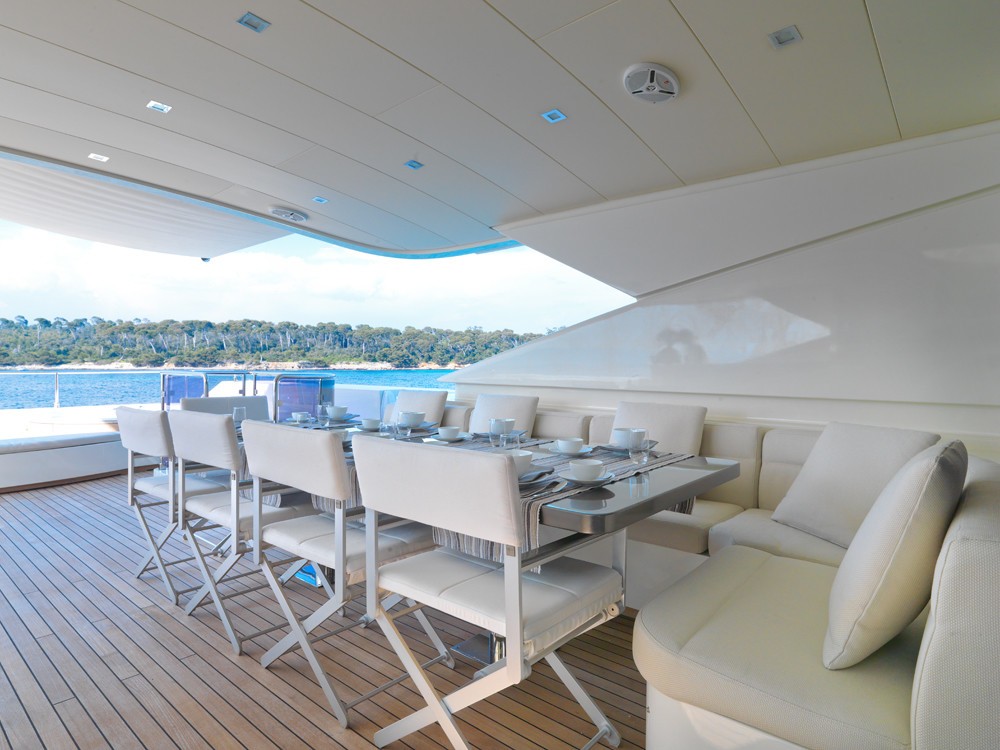 Aft of the main deck is the alfresco dining space, where guests can taste delicious cuisine prepared by the chef and enjoy the picturesque views.