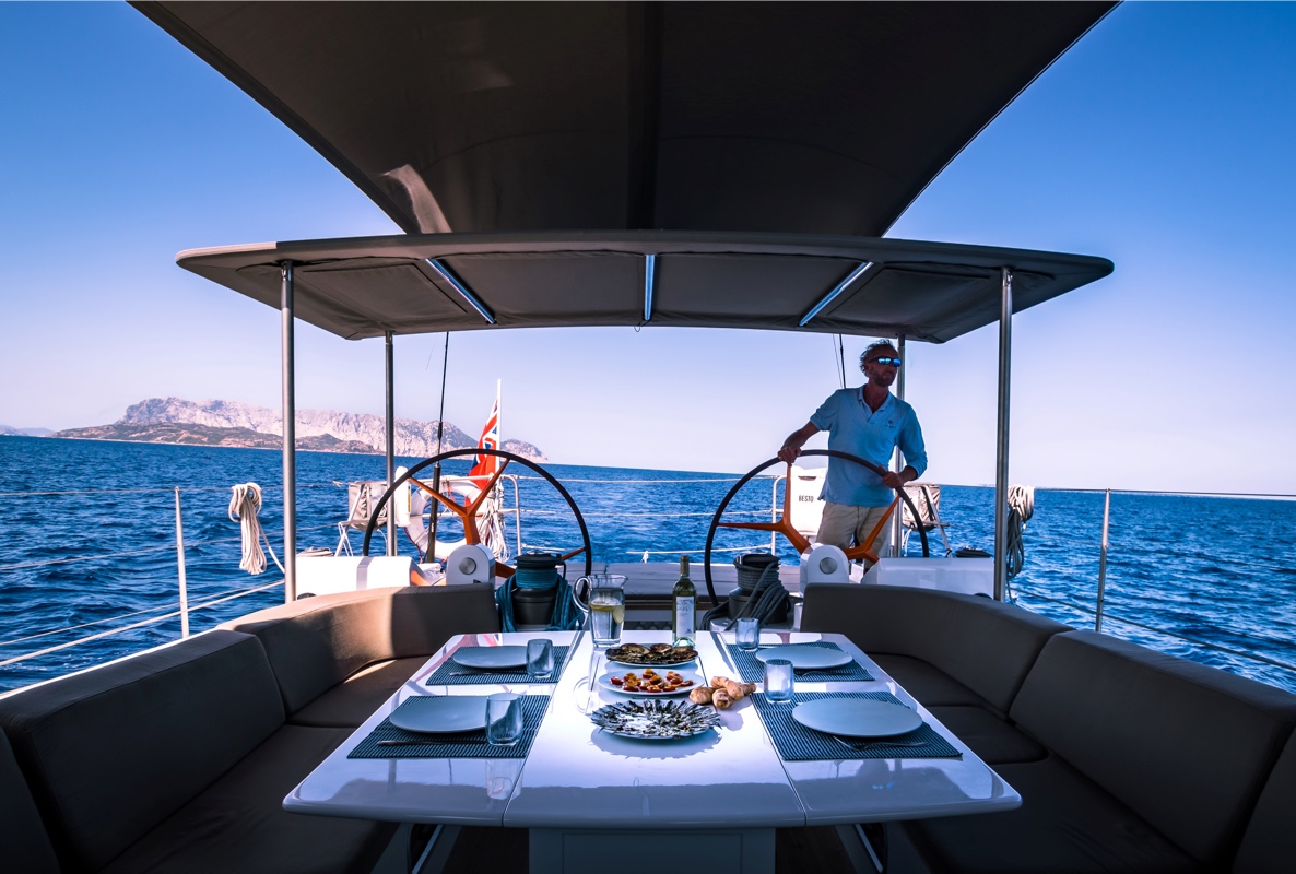 Above deck, the cockpit provides a space where guests can lounge and dine in the sunshine.