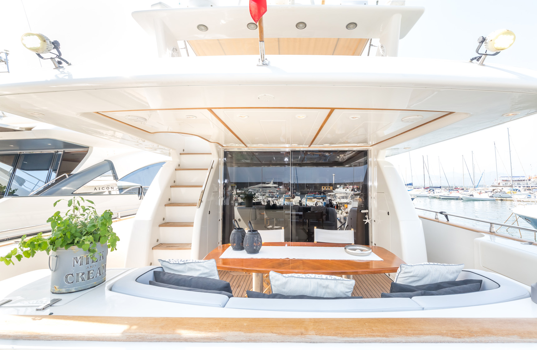 On the main deck, the helm station is placed forward and port with a corner sofa and table opposite creating a casual social environment enjoying plenty of light. Down the starboard side, guests will find the formal dining area, ...