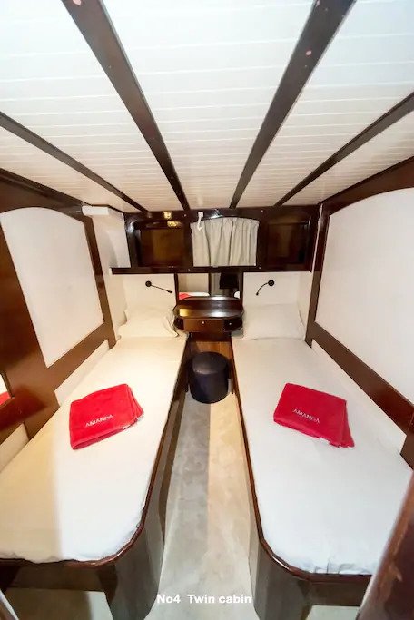 Aft of amidships there are two twin cabins to starboard with bathrooms on the port side, and two double cabins are placed side-by-side to the aft.