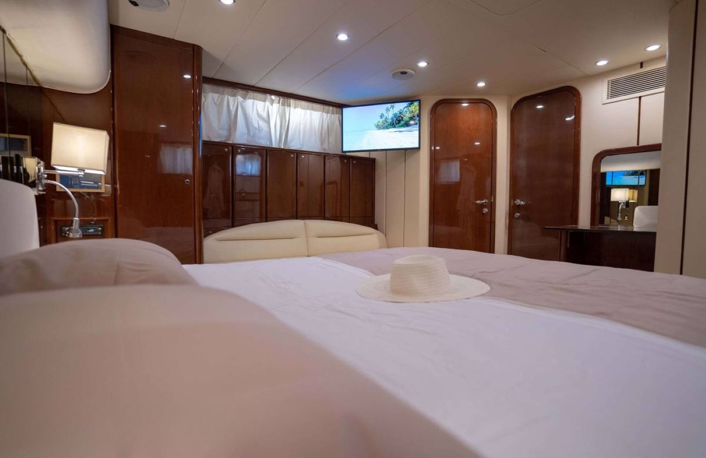 The lower deck hosts the guest and crew accommodation, the former consisting of a Master suite, a double ...