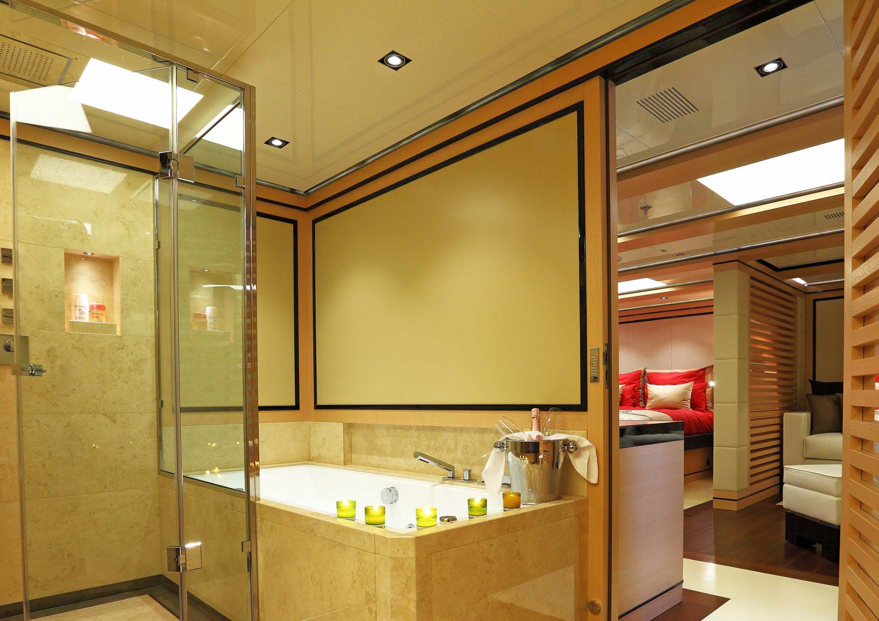 ~ On the main deck the Master suite is situated forward and contains a king-size bed, sizeable lounge, a desk, a 60" flat screen TV and a walk-in wardrobe.