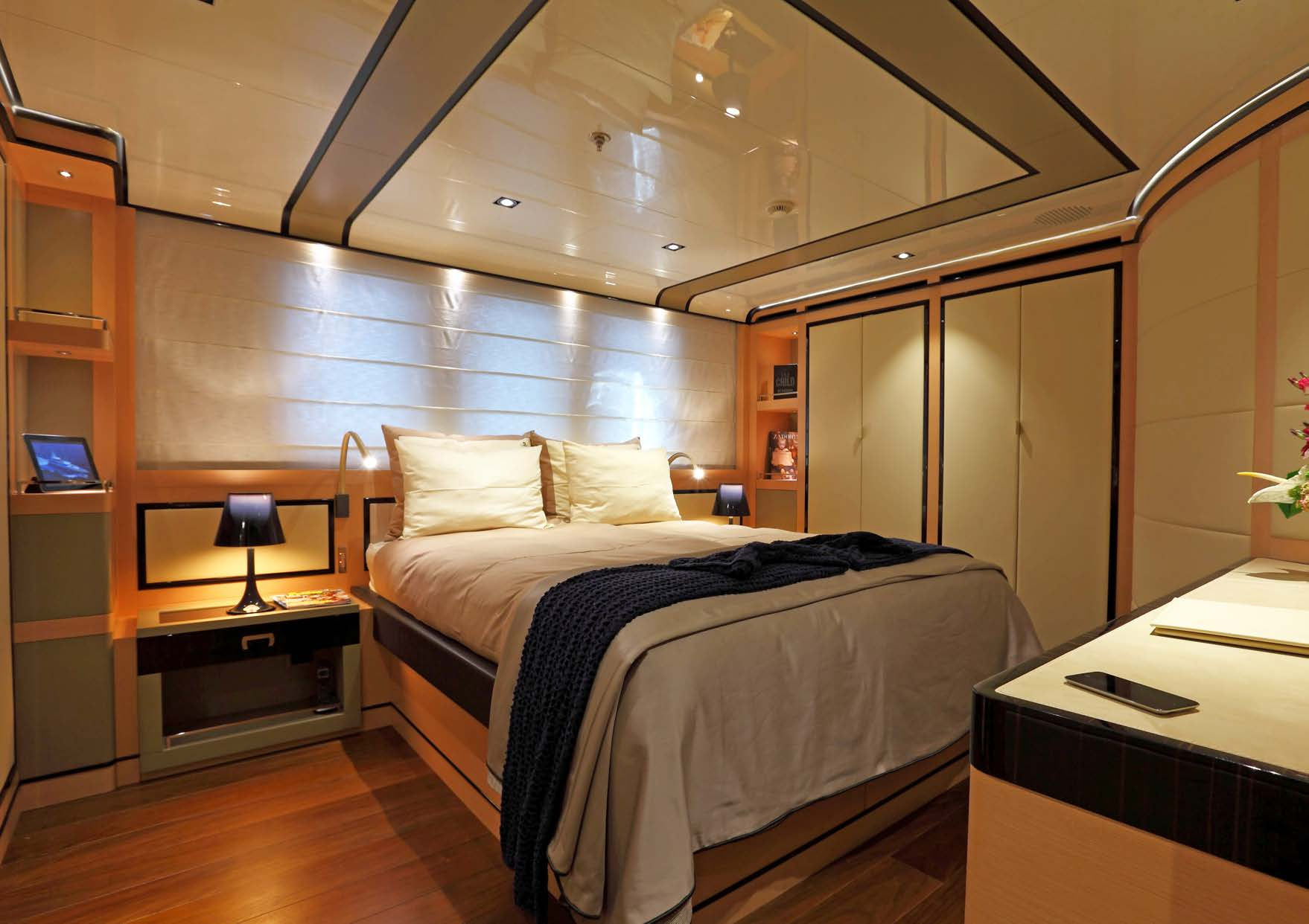 The lower deck hosts the crew accommodation and mess in the bow, while the guest accommodation is located amidships and contains two forward twin cabins and two VIP staterooms behind.