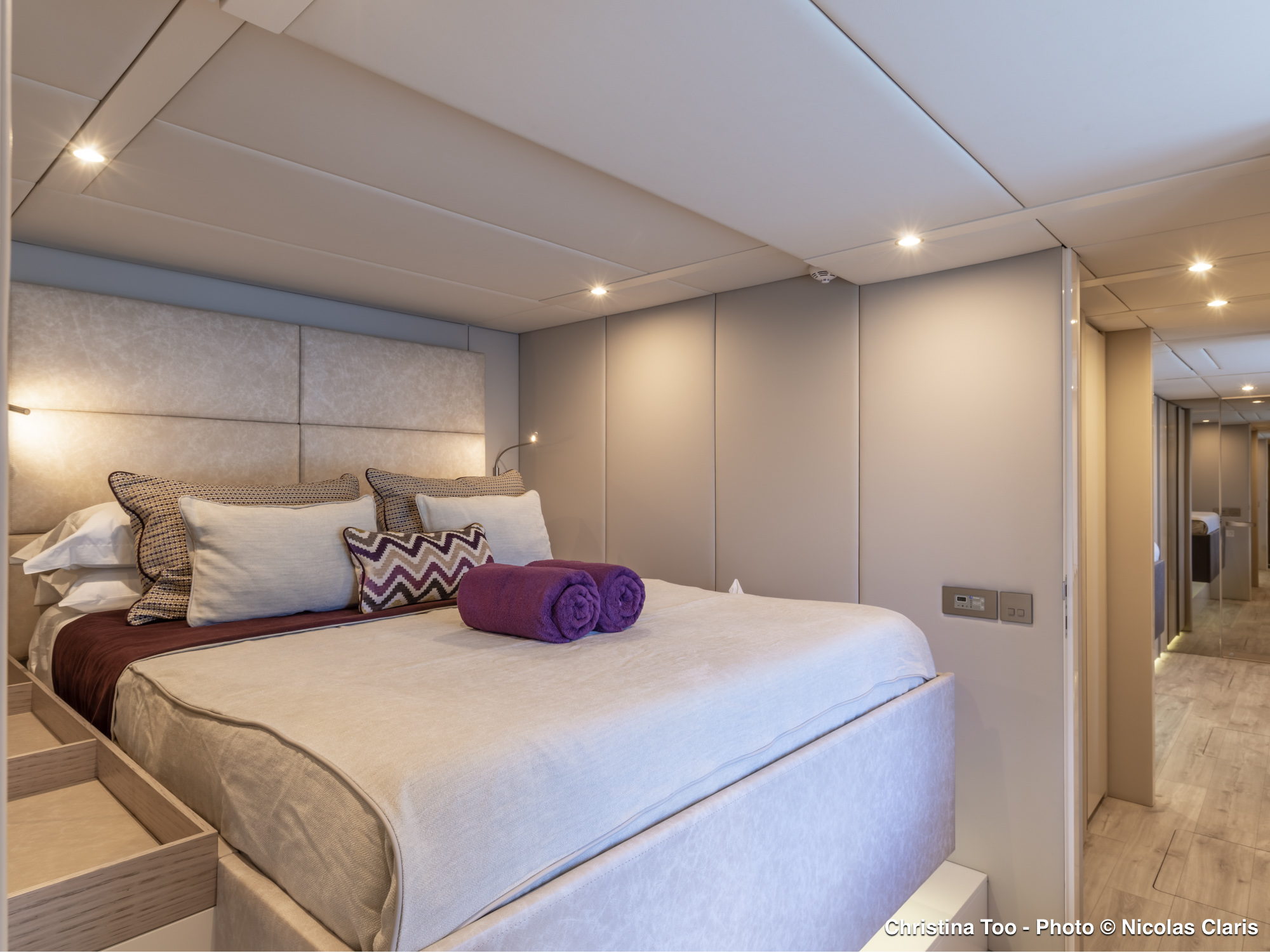 She was built by Sunreef Yachts in 2017 and offers accommodation for up to eight guests in four cabins. There is a crew of three offering exceptional service during your entire crewed charter vacation.