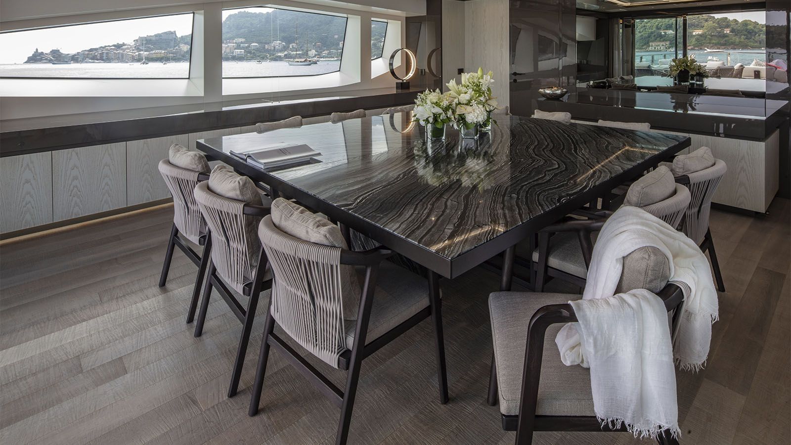 The ottoman in between has a soft fabric cover that can be used as a footrest or as a coffee table. Close to the doors into the salon is an alfresco dining setting that provides for up to 12 guests in the shade.