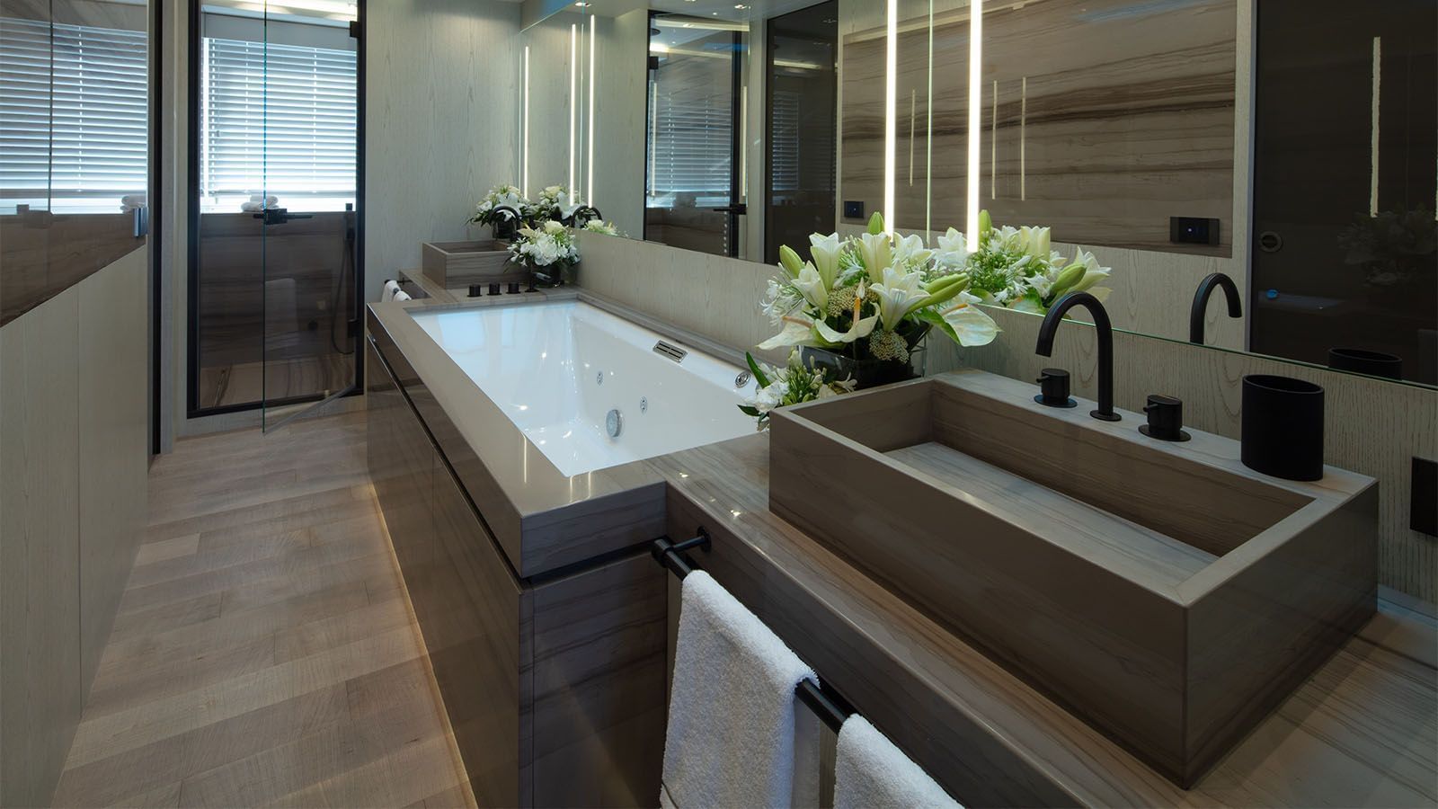 The aft main deck section is an open-plan room with the glamorous formal dining area placed forward and the lounge to the aft, placing two sofa-chaises around a coffee table. Floor-to-ceiling windows coupled with glass sliding ...