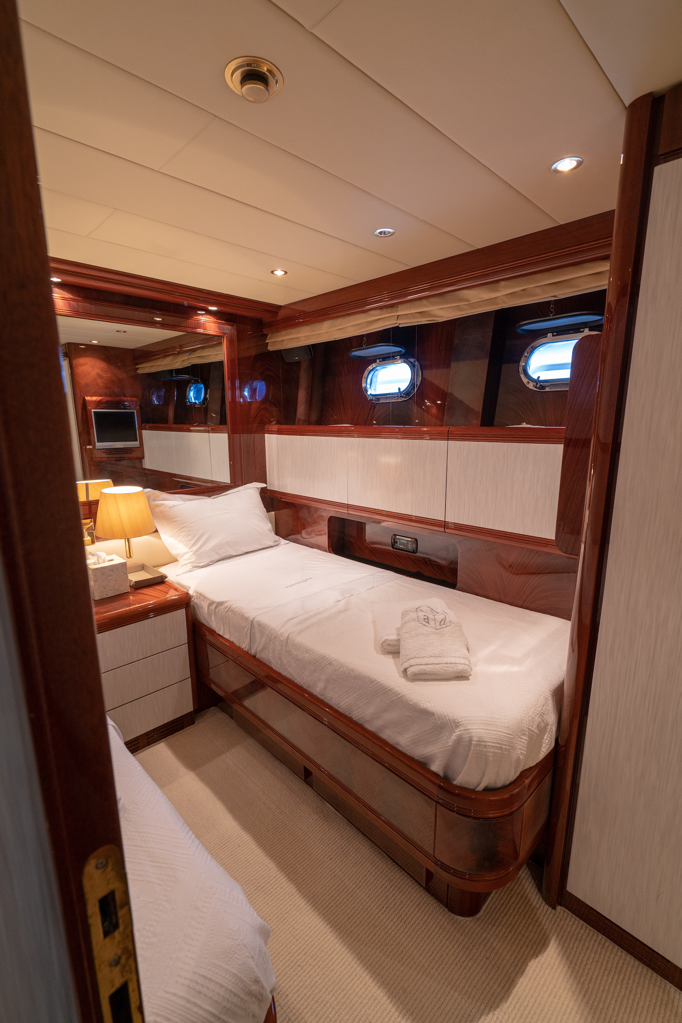 Constructed with a GRP hull and superstructure, this speedy open yacht cruises at 35 knots and sleeps a maximum of seven guests over three cabins, and eight guests can be on board while cruising. The crew of two will ensure that ...