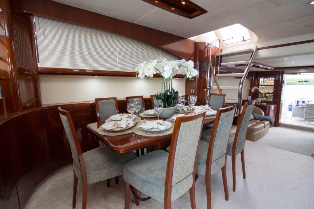 Here, a sofa lines the stern and the table and additional chairs make this sheltered area ideal for alfresco dining and outdoor lounging throughout the day. A widescreen TV is attached to the ceiling in the forward port corner, ...