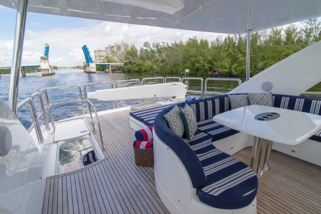 The central flybridge is covered by a bimini, beneath which there is a C-shaped sofa around a drinks table and additional seating beside the forward helm station.