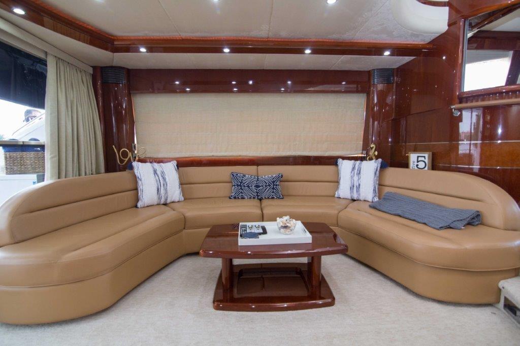 Above, the open-plan layout allows for plenty of sunshine through the windows on every side. Behind the forward helm station, there is a formal dining area to seat up to eight guests beside the starboard-side window.