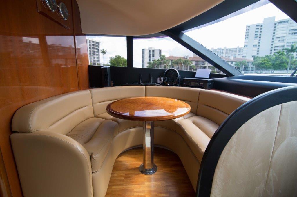 The central flybridge is covered by a bimini, beneath which there is a C-shaped sofa around a drinks table and additional seating beside the forward helm station.