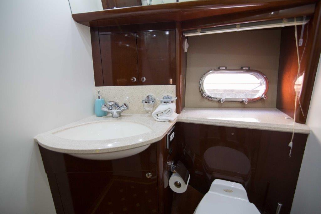 Above, the open-plan layout allows for plenty of sunshine through the windows on every side. Behind the forward helm station, there is a formal dining area to seat up to eight guests beside the starboard-side window.