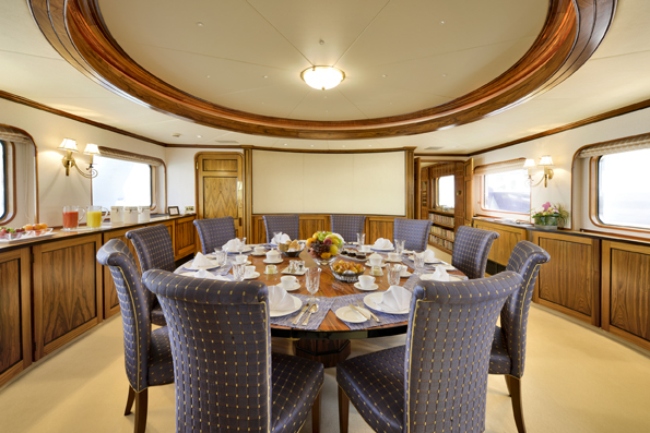 A C-shaped sofa, raised table and additional chairs form a generous alfresco dining area, and delectable dishes can be complemented by refreshments from the skylounge bar. Two L-shaped sofas curve along the stern for guests to ...