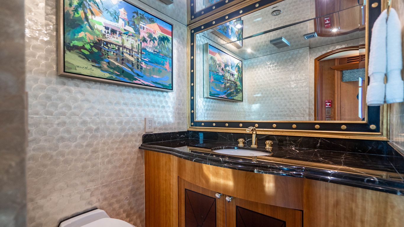 Master King stateroom with ensuite His and Hers bath are amidship below. Two Queen guest staterooms can convert into twin staterooms both with en-suite baths.