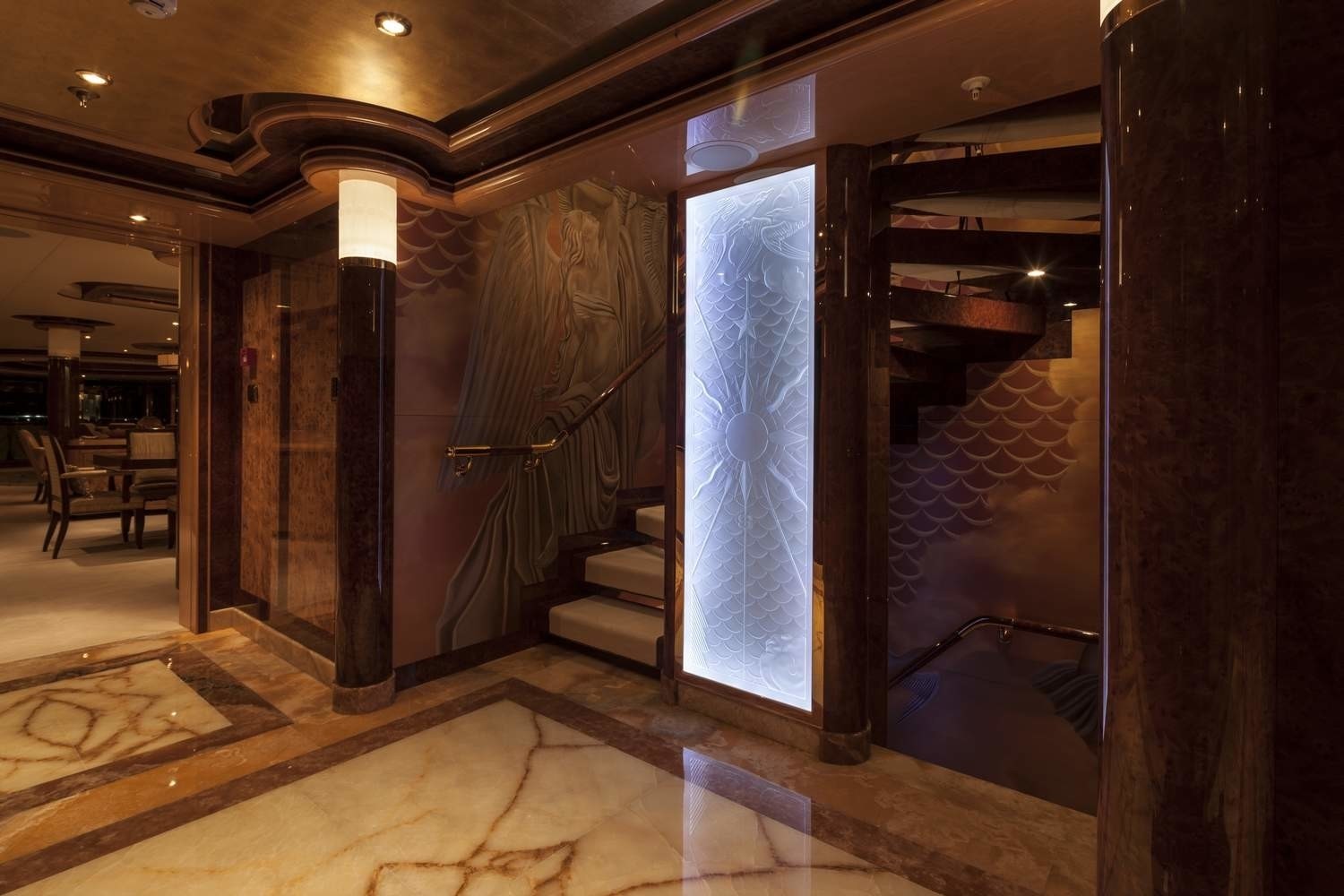 The master suite is placed forward on the main deck, with the main foyer, galley and crew access corridors amidships.