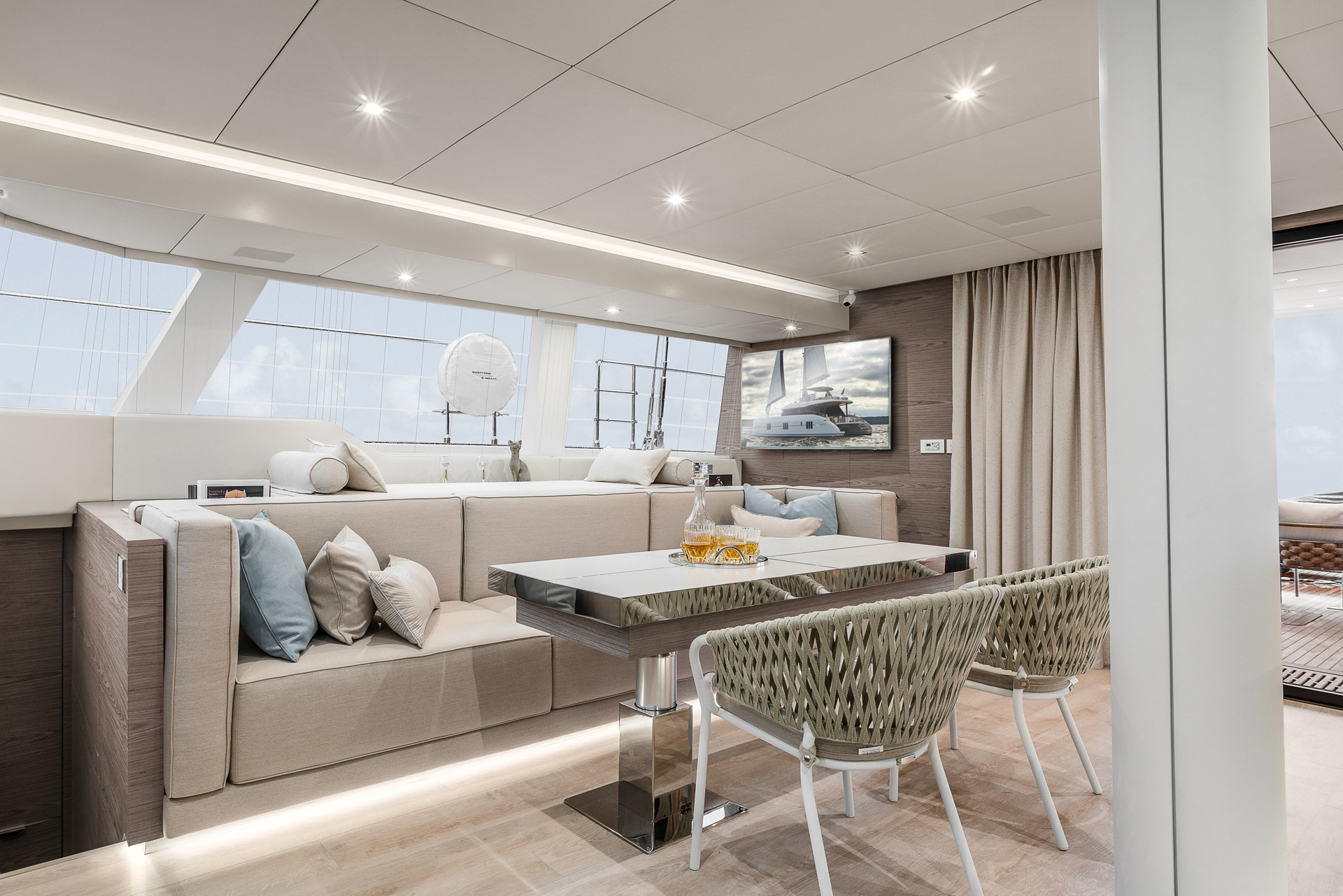 Above the saloon features a clean design, offering space for dining and relaxation as well as an open-plan galley. The entire area has large windows, allowing for a great amount of light to penetrate the interiors.