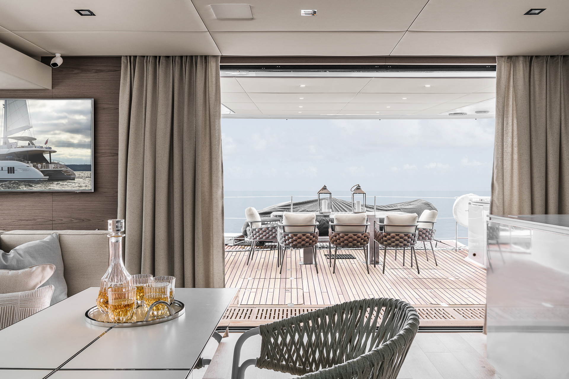 The aft deck has been fitted with a large table offering a fabulous alfresco dining possibility, in addition to a seating area. Forward, there are two large sunbathing areas as well as the trampolines to fully enjoy the sunshine and relax to the maximum.