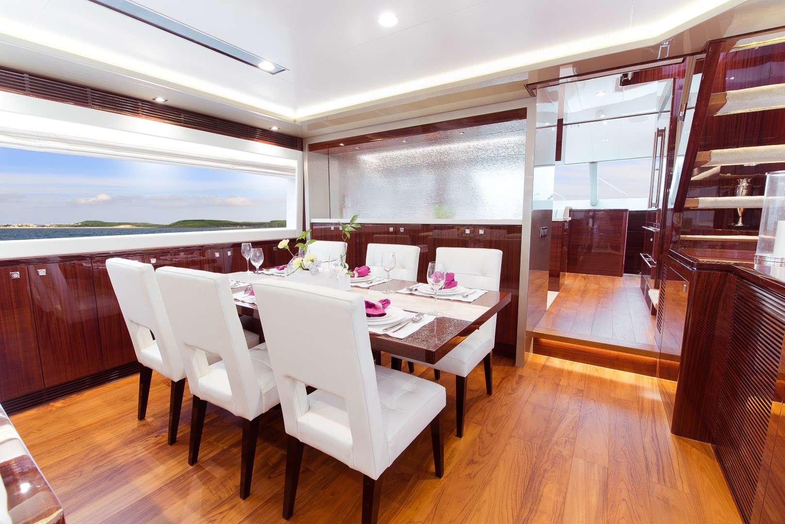 The main deck aft cockpit is fitted with a sofa along the stern and a raised alfresco dining table for use by the whole group. A wet bar is placed in the starboard corner with a widescreen TV descending from the ceiling.