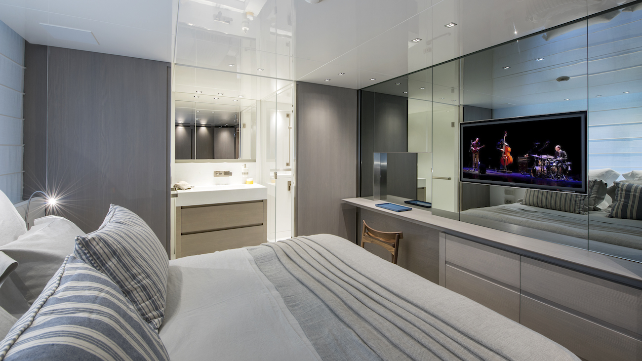 A port staircase leads to the upper deck, where a spongy double sunpad can be found to the stern with a sofa/sunpad to port and starboard.